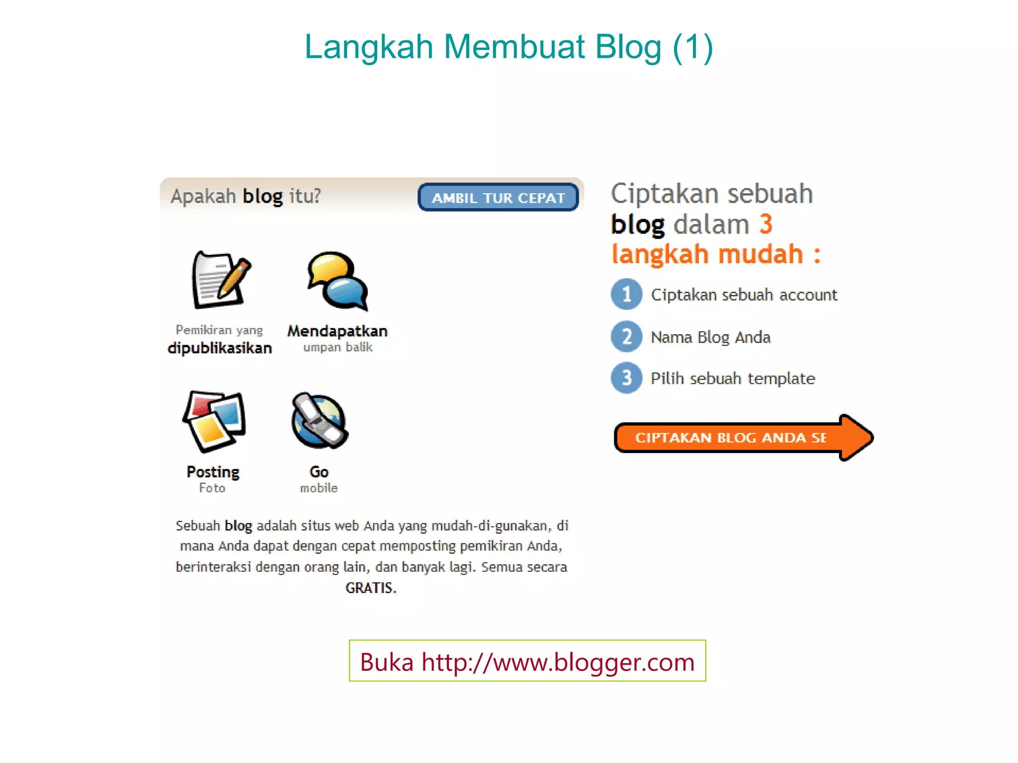 Dokumen ini menjelaskan langkah-langkah untuk membuat blog menggunakan Blogger, mulai dari pendaftaran hingga penyuntingan tampilan. Langkah-langkah tersebut mencakup pengisian formulir, pemilihan nama dan template, serta proses pengeditan HTML dan elemen halaman. Ini memberikan panduan praktis bagi pengguna yang ingin membuat dan menyesuaikan blog mereka.