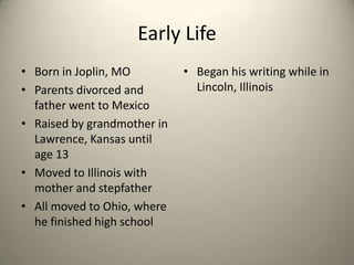 Langston Hughes was an influential African American poet and writer born in 1902 in Missouri. He was raised primarily by his grandmother in Kansas and Ohio after his parents divorced. Hughes studied at Columbia University but left to pursue his dream of being a writer against his father's wishes. He published his first book of poetry in 1926 and went on to write poetry, plays, novels, and anthologies that were hugely influential on the Harlem Renaissance. Hughes died in 1967 in New York from prostate cancer and his home was later designated a landmark in his honor.