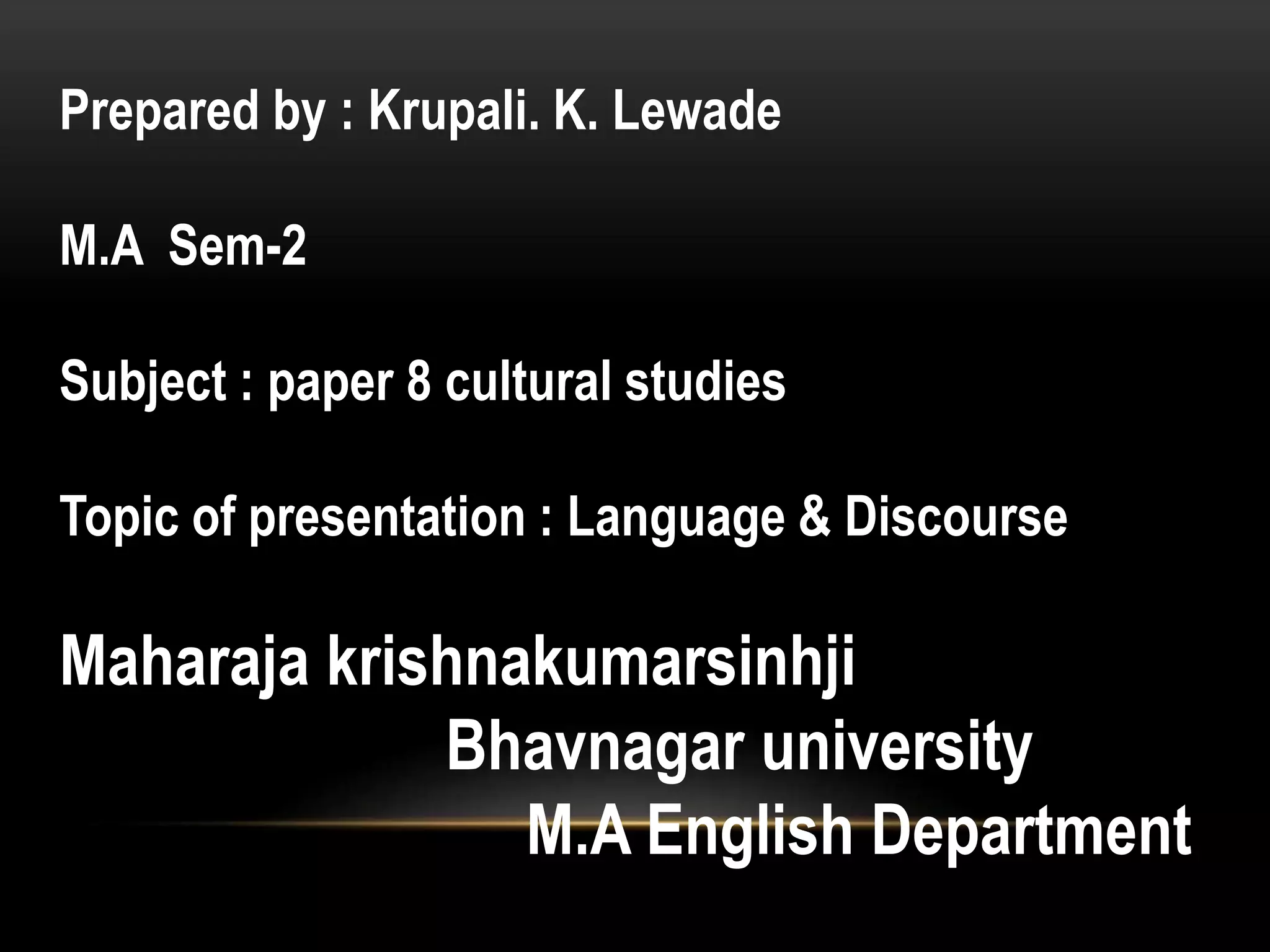 The document discusses the relationship between language, discourse, and cultural studies, elaborating on how communication and meaning creation are essential for forming community. It emphasizes that culture consists of shared meanings and values, which are negotiated and expressed through various means, including language, art, and symbols. The study of cultural representations is crucial for understanding the complexities of society, as every identity and object requires a contextual representation.