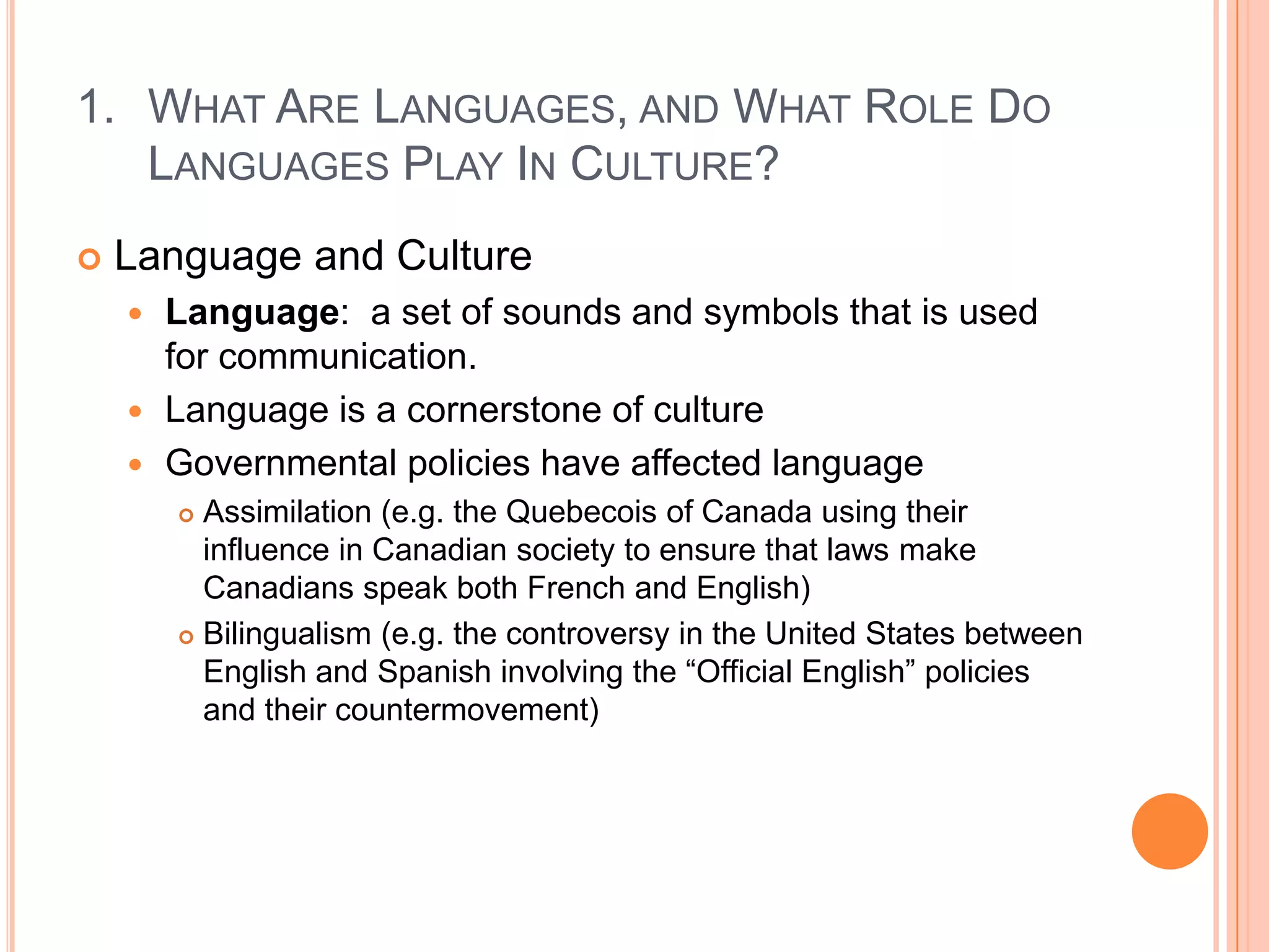 Language plays an important role in culture. This chapter discusses what languages are, how they develop and spread, and how they shape places and identities. It explores how languages form language families over time through sound shifts. The Proto-Indo-European language is used as a case study to show how linguists reconstruct ancestral languages and trace their diffusion. The chapter also examines how multilingualism, dialects, and global languages develop and impact geopolitics. Finally, it analyzes how place names can change due to factors like decolonization, revolution, and commercialization.