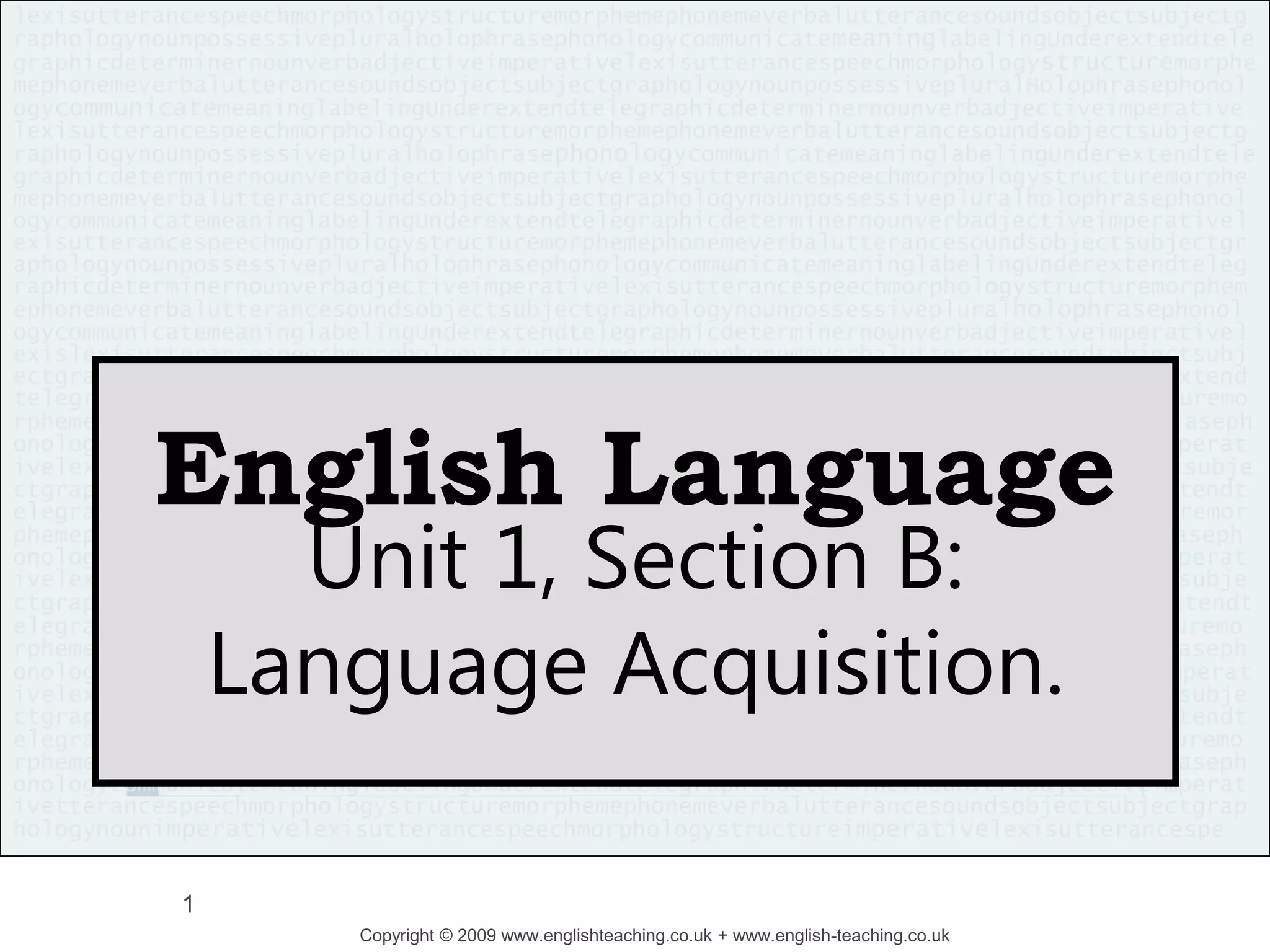 The document discusses various linguistic terms and concepts related to language acquisition, including babbling stages of infants and theories from key child language acquisition researchers. It also provides sample texts and tasks about studying language development topics like routines, theories, and analyzing child language data. The majority of the document appears to be materials for instructing students on the topic of how children acquire their first language.