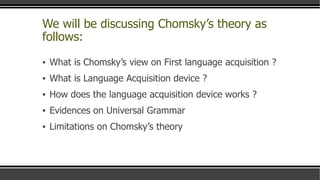 Chomsky's theory of language acquisition proposes that humans are born with an innate language acquisition device (LAD) that contains a universal grammar (UG). The LAD allows children to learn language by triggering the UG in response to linguistic input from their environment. According to Chomsky, the linguistic environment alone is not sufficient for language learning, and children must rely on an innate, biological predisposition to acquire language. Evidence for Chomsky's theory includes similarities in children's developmental stages and their ability to distinguish sounds not present in their native language. However, critics argue that Chomsky's theory neglects the important role of social interaction and psychological factors in language acquisition.