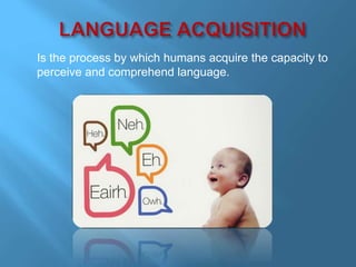 Language acquisition is the process by which humans develop the ability to understand and use language. There have been several theories that attempted to explain this process, including Skinner's theory of reinforcement and Chomsky's theory of universal grammar. Contemporary research has led to hypotheses such as the acquisition-learning distinction, the natural order hypothesis, the monitor hypothesis, the input hypothesis, and the affective filter hypothesis. Language acquisition occurs in stages from babbling to one-word utterances to telegraphic speech and finally fluency. First and second language acquisition follow similar stages but second language acquisition takes longer to progress through the stages.