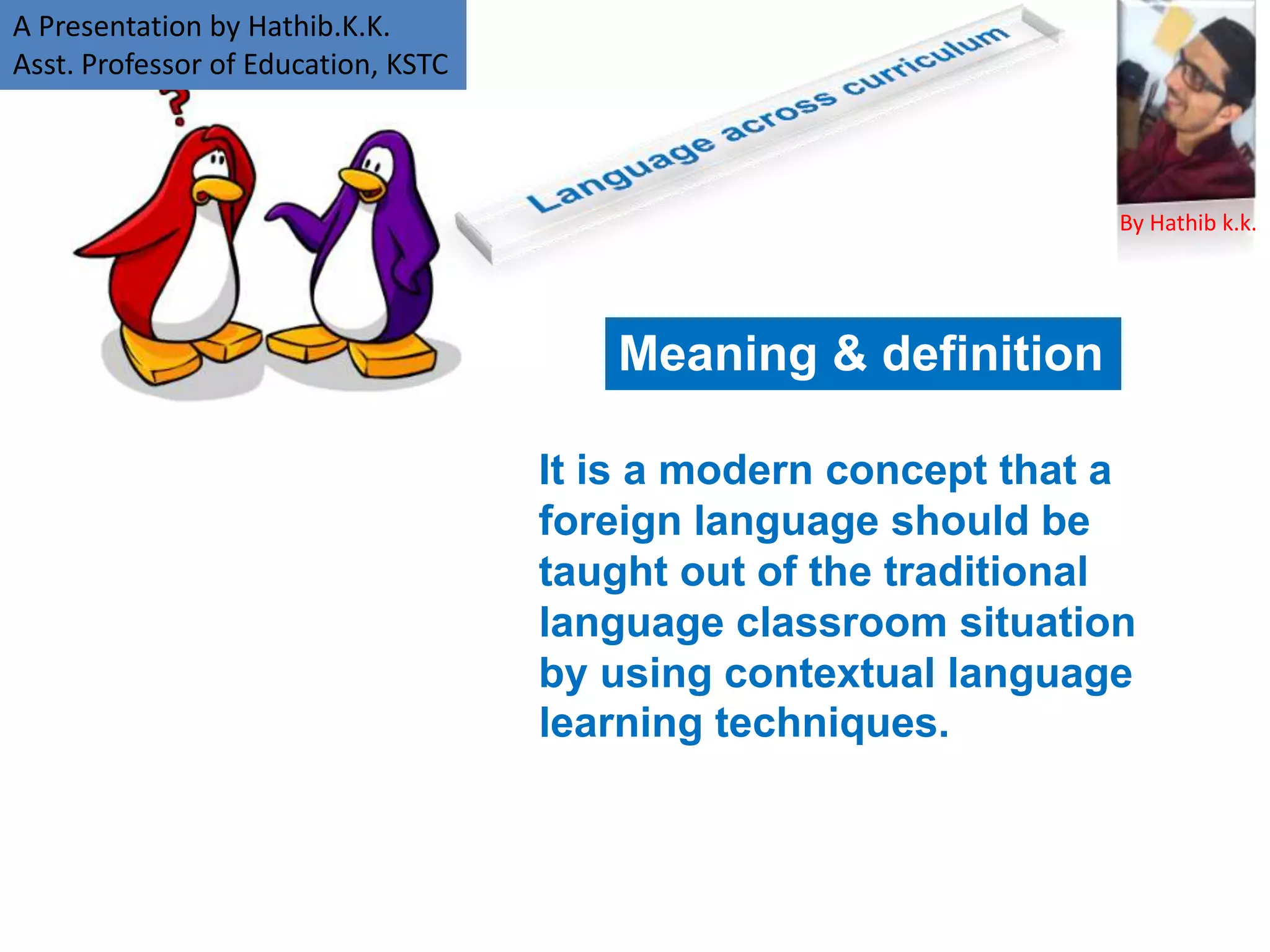The document presents 'Language Across Curriculum' as a modern approach to teaching foreign languages, emphasizing its importance in improving communication skills and academic performance for both students and teachers. It identifies significant deficiencies in foreign language proficiency among students and teachers, which impede effective learning and career opportunities. The approach integrates language learning across all subjects to enhance understanding, reduce plagiarism in assignments, and foster effective teaching practices.