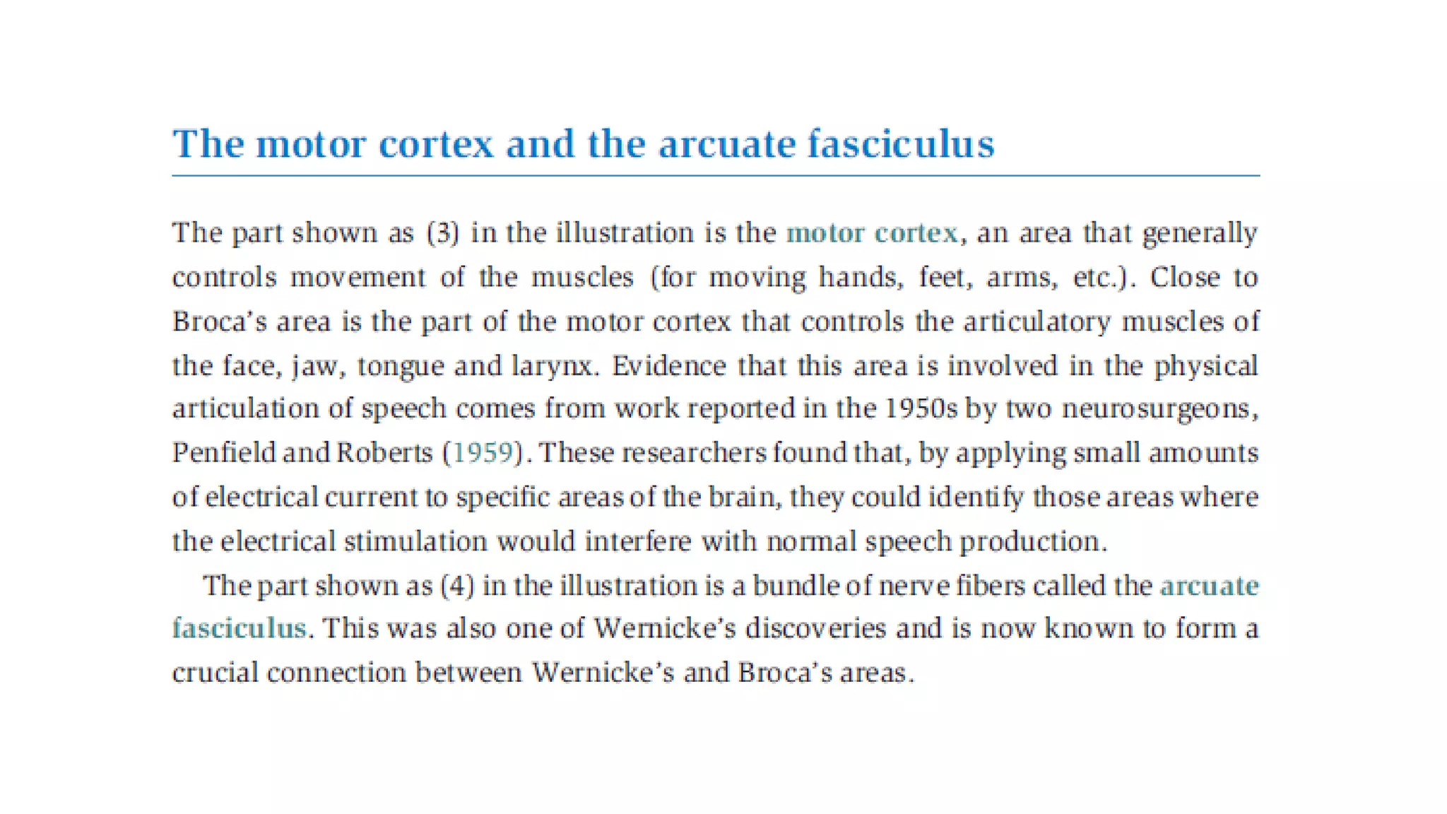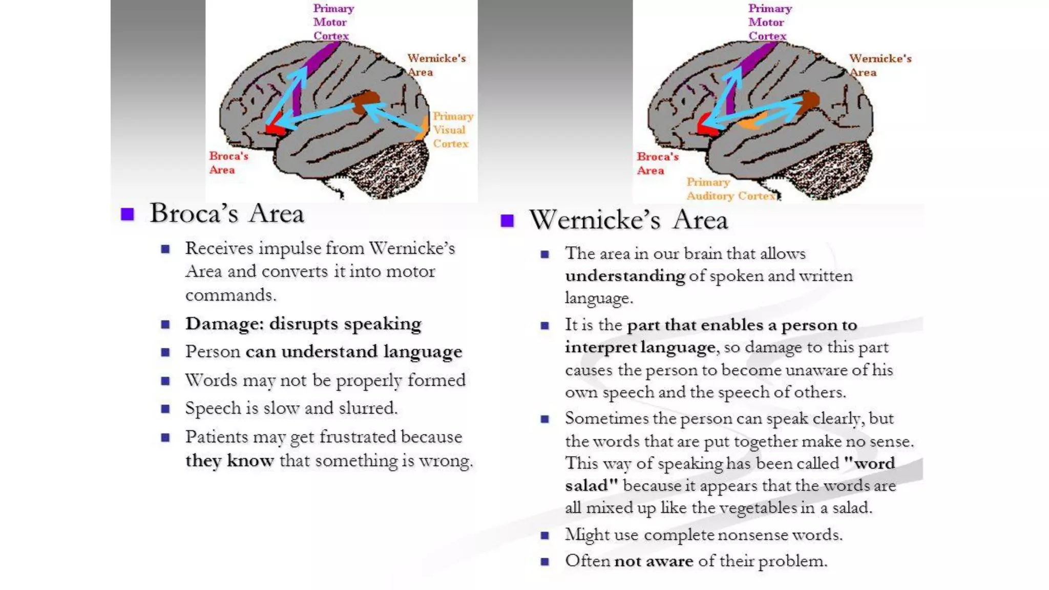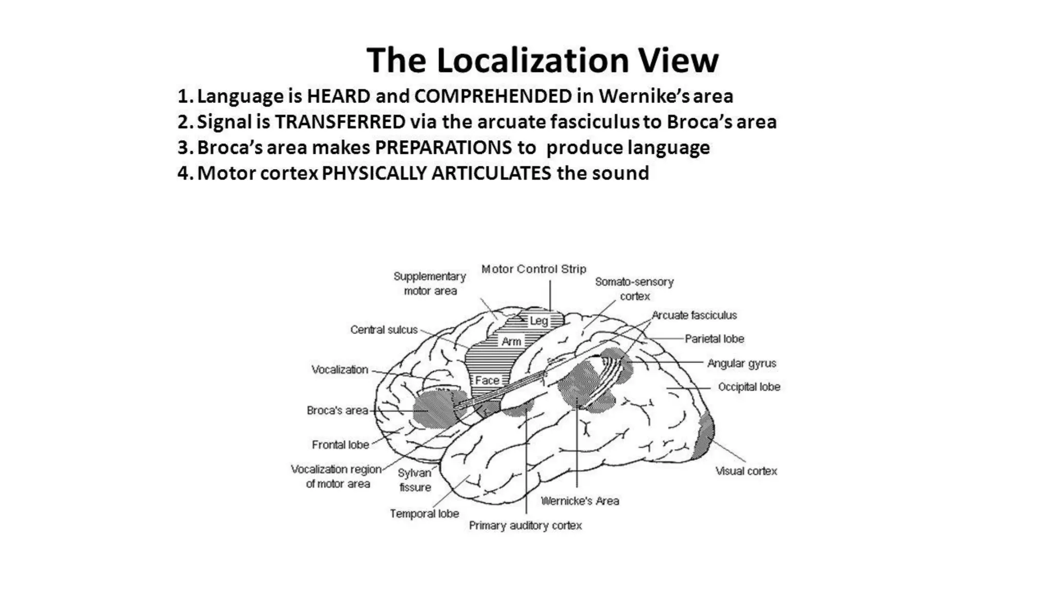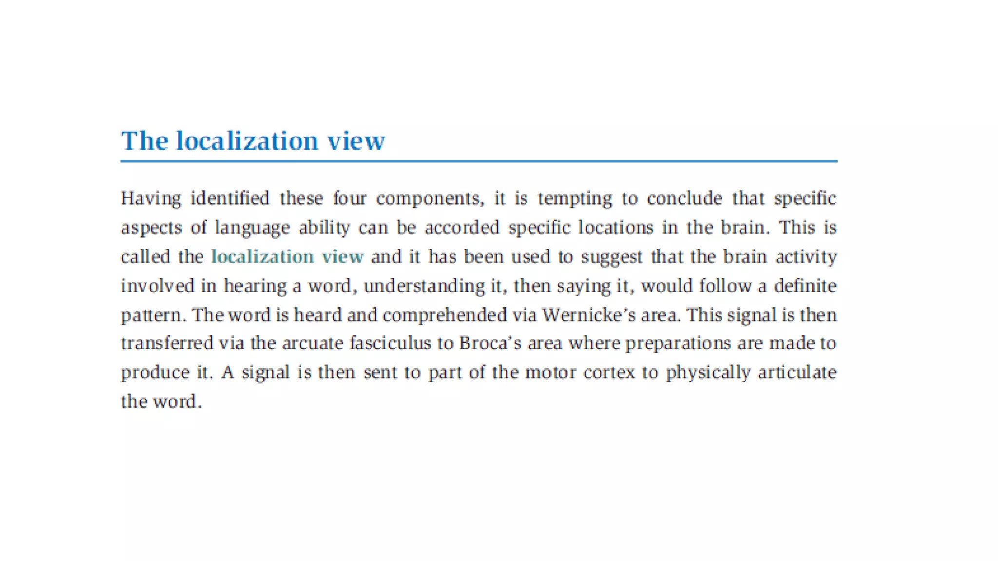 This document discusses the relationship between language and the brain. It outlines two key language areas in the brain - Broca's area, which is involved in speech production, and Wernicke's area, which is involved in speech comprehension. The document examines how linguistic functions are organized in the brain.