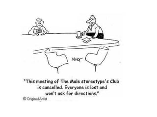 The document discusses gender and language from several perspectives. It begins by distinguishing between sex and gender, noting that sex refers to biological differences while gender refers to culturally constructed roles. It then examines how gender boundaries are conceptual rather than physical, and how they have become more fluid over time. Several lists provide examples of masculine and feminine personality and physical traits as stereotyped by culture. The document also looks at how language use may differ between men and women, such as women using more hedging words and tag questions. Finally, it considers how men and women behave differently in conversations, such as who interrupts more or introduces topics.