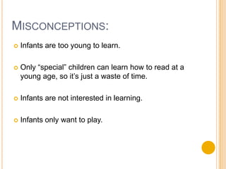 Fostering early language and literacy development in infants is important for future learning. While infants are not born knowing language, they are born with the ability to communicate and acquire language through meaningful interactions with caregivers from birth. Describing daily activities, telling stories, singing songs, asking questions and sharing books can help infants develop important pre-reading skills and lay the foundation for literacy. Engaging infants in dialogue and providing new experiences supports language development and emergent literacy.