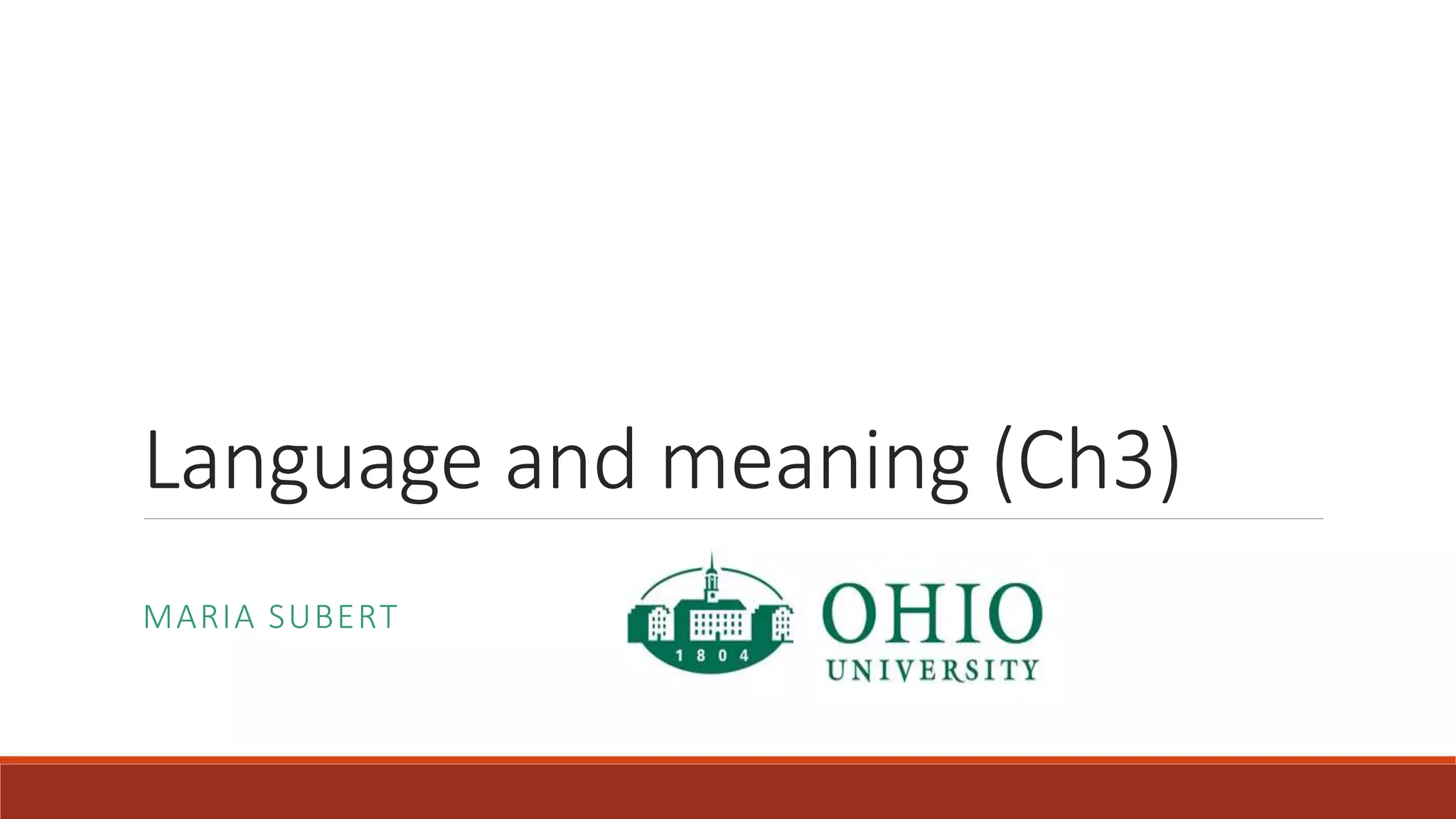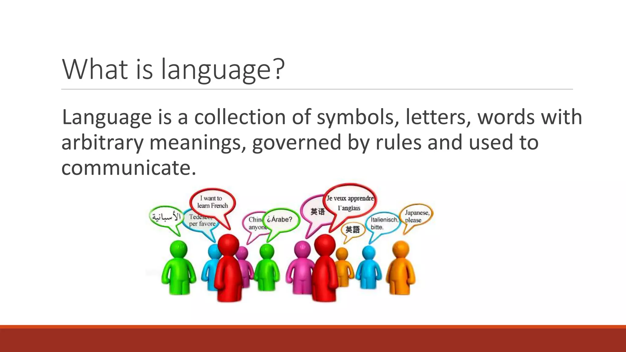 This document discusses key concepts about language and meaning. It defines language as a system of symbols and rules used for communication. It notes that language has semantics, syntax, and pragmatics. Semantics is the study of meaning, syntax is the arrangement of words, and pragmatics is language in social contexts. Additional concepts covered include denotative and connotative meanings of words, operational definitions, descriptive language, and avoiding inferences versus observations.