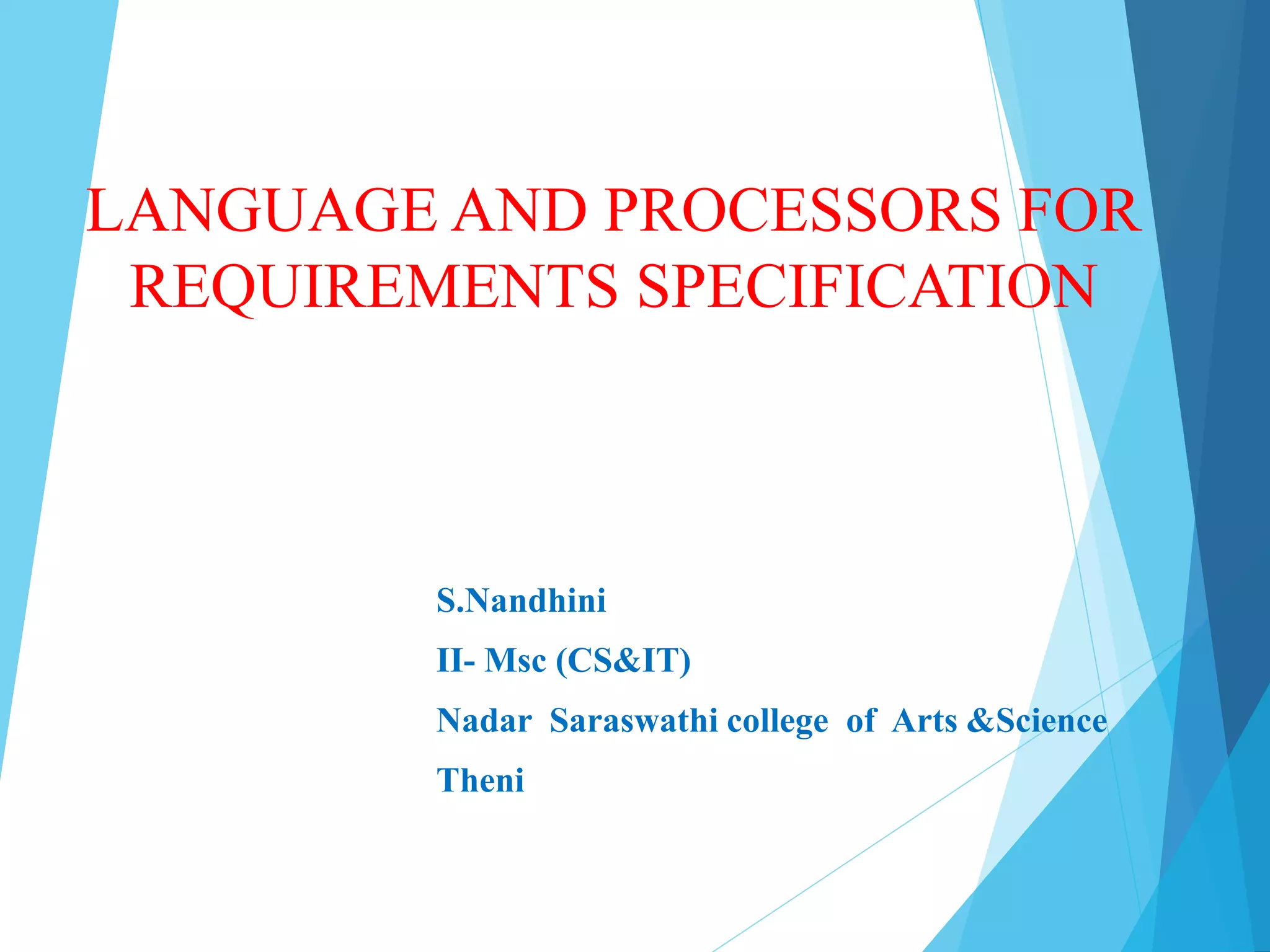 This document discusses several languages and processors that have been developed for requirements specification in software development. It describes Problem Statement Language (PSL) and its processor, the Problem Statement Analyzer (PSA), which were developed to allow concise statement and automated analysis of requirements. It also discusses the Requirements Statement Language (RSL) and Requirements Engineering Validation System (REVS). Finally, it provides a brief overview of Structured Analysis and Design Technique (SADT), including its data and activity diagram components.