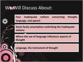 The document discusses four inadequate notions about the relationship between thought, language, and speech: