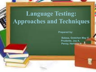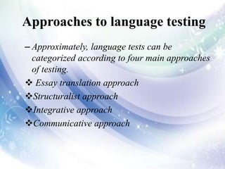 This document discusses different approaches and techniques for language testing. It describes four main approaches: the essay translation approach, structuralist approach, integrative approach, and communicative approach. Each approach is defined and its strengths and weaknesses are outlined. The document also covers various testing techniques such as direct vs indirect testing, discrete point vs integrative testing, norm-referenced vs criterion-referenced testing, and objective vs subjective testing.
