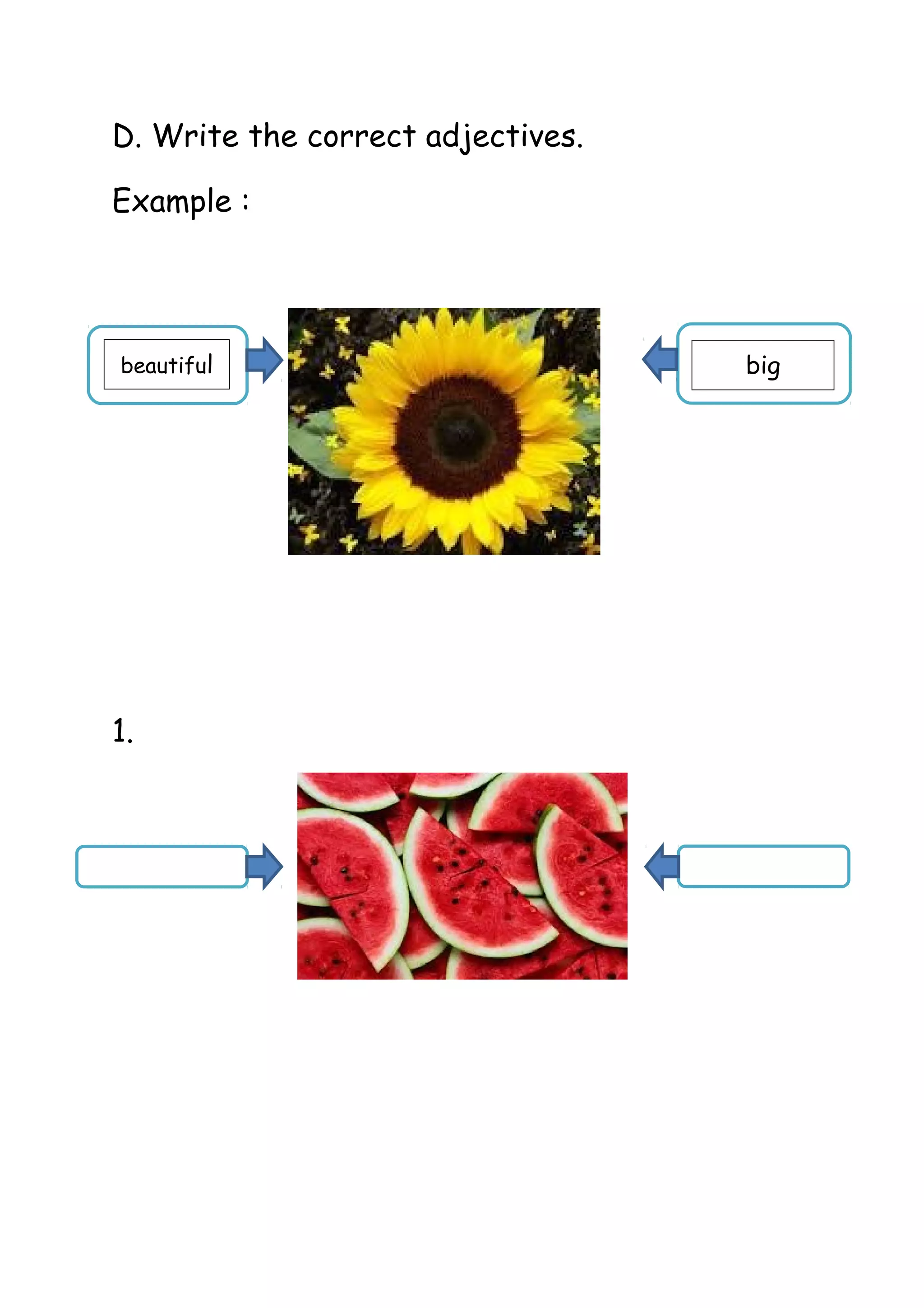This short document provides an example of filling in an adjective to describe something. It asks the reader to write the correct adjectives for 3 items but does not provide any other context or details.