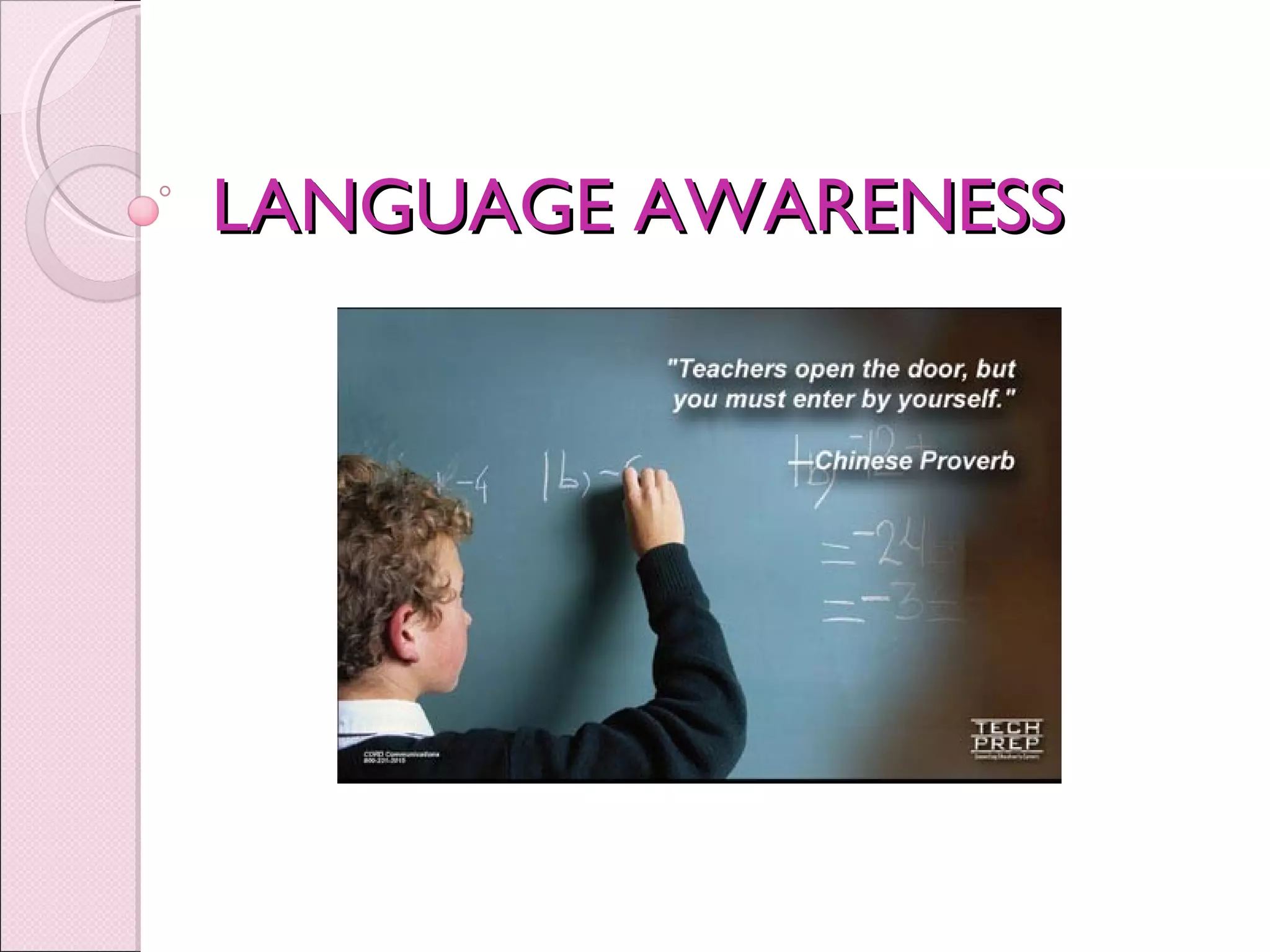 The document discusses language awareness and how it is acquired. It defines awareness as the ability to perceive or be conscious of events, objects or patterns. Language awareness refers to explicit knowledge about language and conscious perception of how languages work and are used. The document notes that some degree of conscious awareness is necessary for restructuring a learner's mental representation of a language. It provides examples of awareness-raising activities like focusing on language rules to help learners identify gaps in their knowledge.