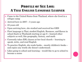 This document summarizes research on the Thai language and profiles a Thai English language learner named See Loh. It compares features of the Thai and English languages, such as Thai having 44 consonants and 32 vowels while English has 26 letters. It also discusses See Loh's language errors and interlanguage development, noting differences between Thai and English grammar contribute to her mistakes. The document concludes that understanding these differences can help educators properly instruct Thai English learners.