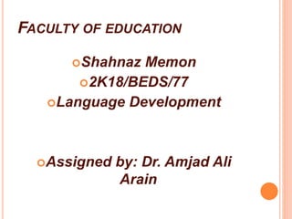 The document discusses language development in children, focusing on stages from vocalizations to fluent speech, highlighting key components such as hearing, cognitive development, and social interactions. It reviews theories on language acquisition, including the behaviorist approach by B.F. Skinner, the nativist approach by Noam Chomsky, and the cognitive approach emphasizing social interaction. Current understanding suggests a combination of biological predispositions and environmental reinforcement contributes to language development.