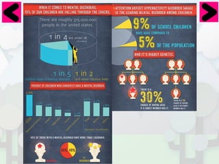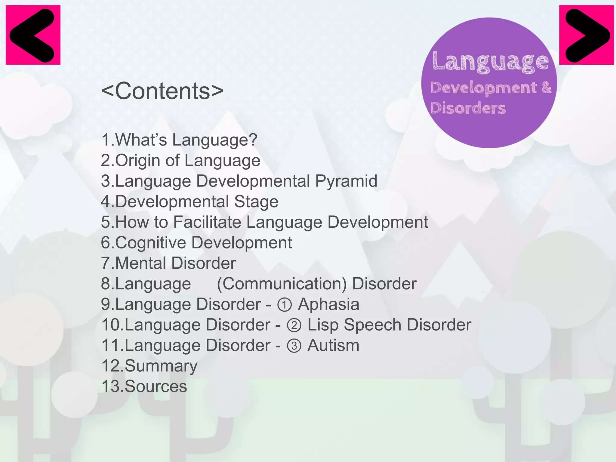 The document discusses language development and language disorders in children. It describes the stages of language development from birth to age 5. It also discusses several common language disorders, including aphasia, lisps, and autism. The causes of language disorders can include genetic factors, developmental problems, accidents, or damage to parts of the brain involved in language processing. Early intervention and treatment is important to address language delays or disorders in children.