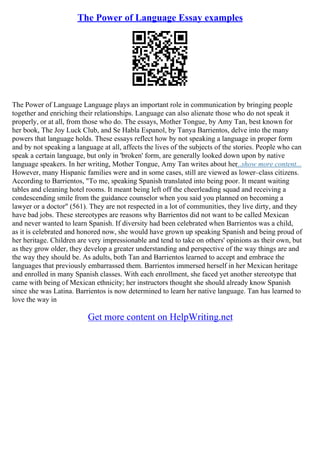 The document discusses the significant role of language in communication, emphasizing its ability to connect and separate people. It highlights personal experiences from various authors, including Amy Tan and Tanya Barrientos, who explore the impact of language on identity and cultural perceptions. Furthermore, it argues that learning languages shapes one’s worldview and that stereotypes often arise from language misinterpretations, stressing the importance of education in overcoming these biases.