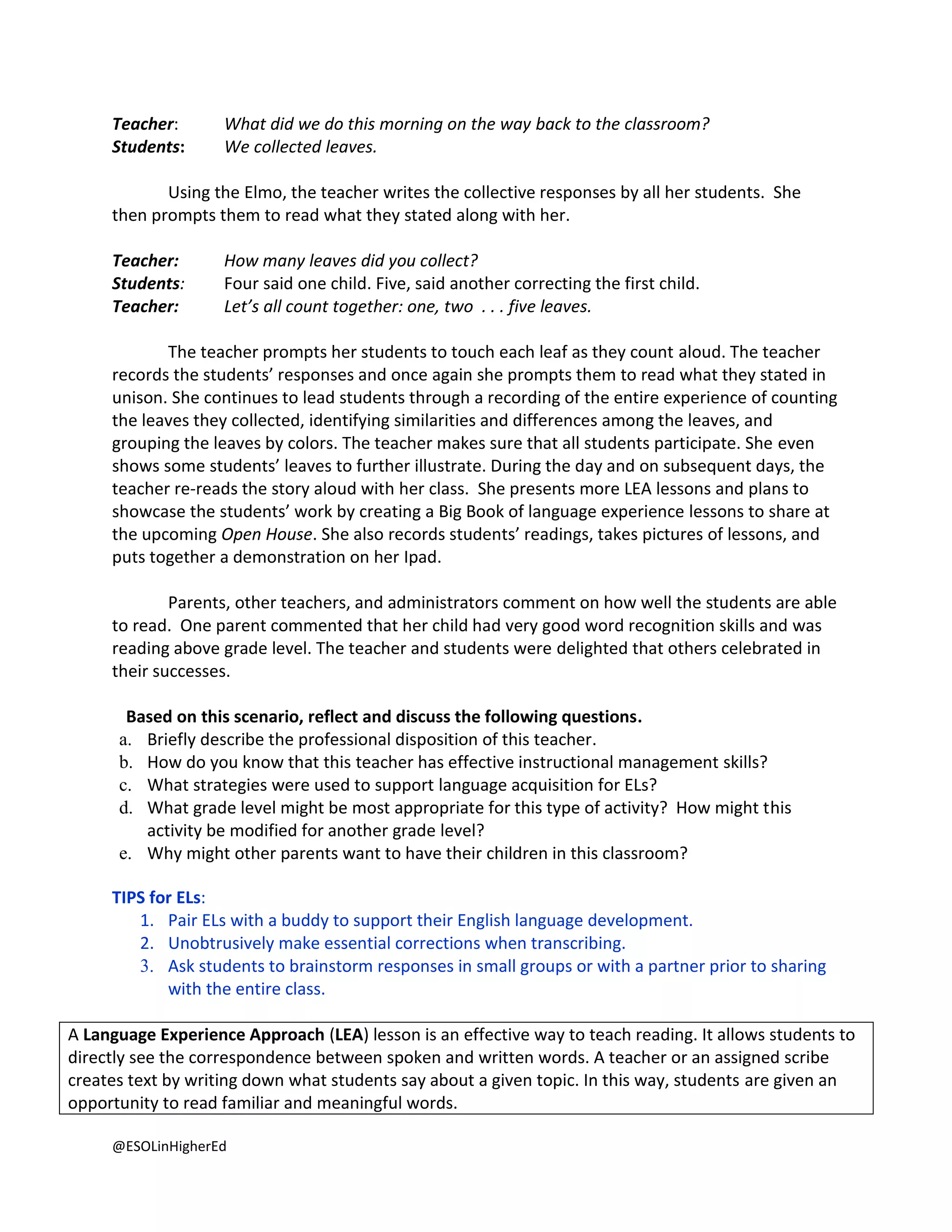 This document describes a Language Experience Approach (LEA) lesson conducted by an elementary school teacher in Florida. The teacher had students collect leaves outside, then guided them through describing the experience. As the students shared what they did, the teacher wrote down their words to create a class-generated text. The teacher had the students read the text together multiple times. This LEA lesson supported language acquisition for English learners and helped develop reading skills for all students.