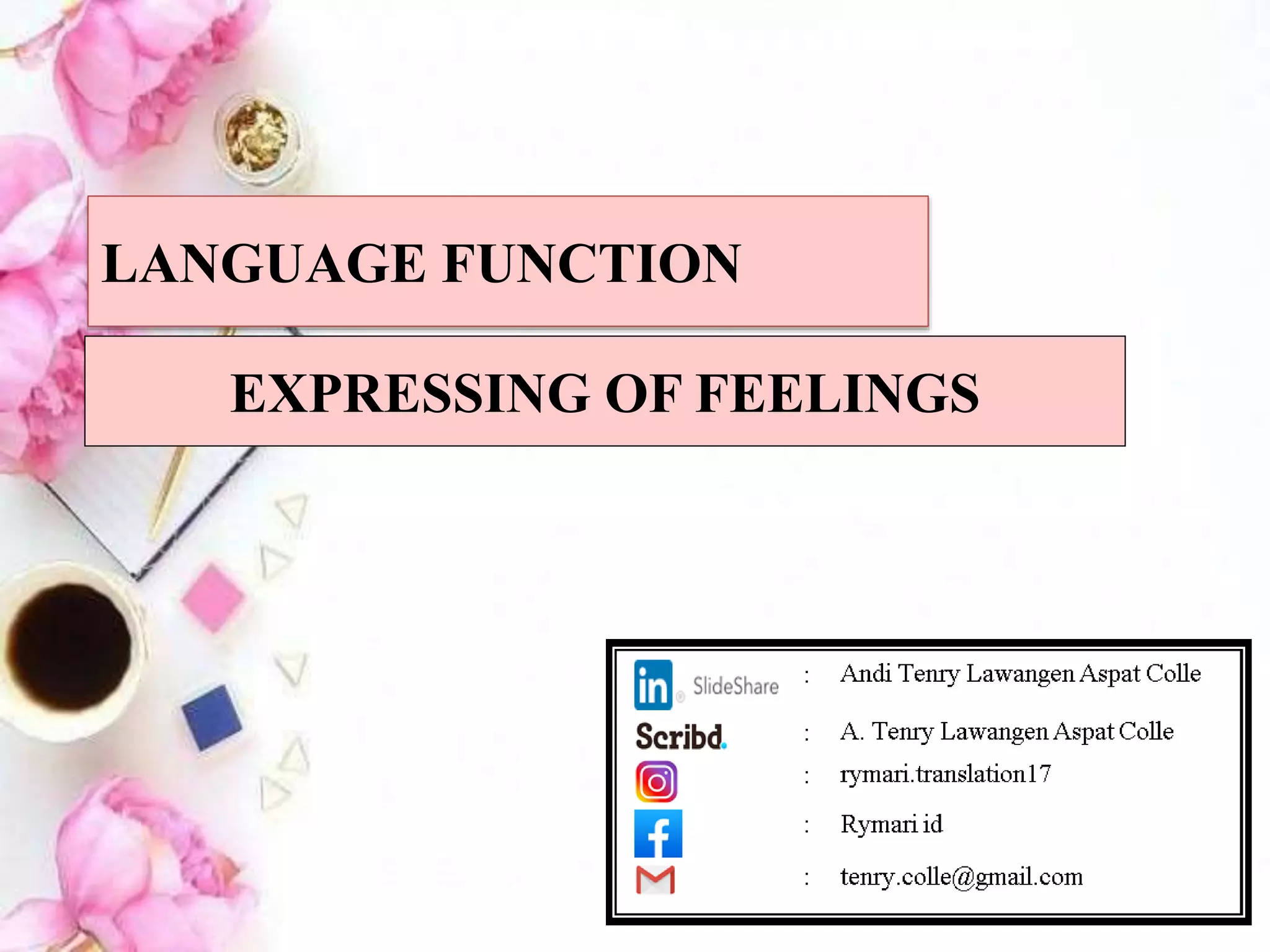 The document discusses various ways to express feelings and reactions in English using common phrases and expressions. It covers expressing feelings like interest, boredom, tiredness, sympathy, worries, relief, how easy or difficult something is, and disappointment. Examples are provided for expressing feelings like love, happiness, sadness, pleasure, anxiety, anger, pain or that something is fascinating, intriguing, boring, exhausting, sorry, scary, a relief, easy, hard, or disappointing.