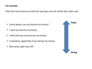 Language functions refer to the purposes for which language is used, such as communicating formally or informally. The tone used also depends on the function. For example, when Peter lent money to Carlos and wants it back after a month, there are polite and strong ways for Peter to phrase his request to borrow the money back, ranging from a polite question to a more demanding tone using words like "must" or a short, direct phrase.