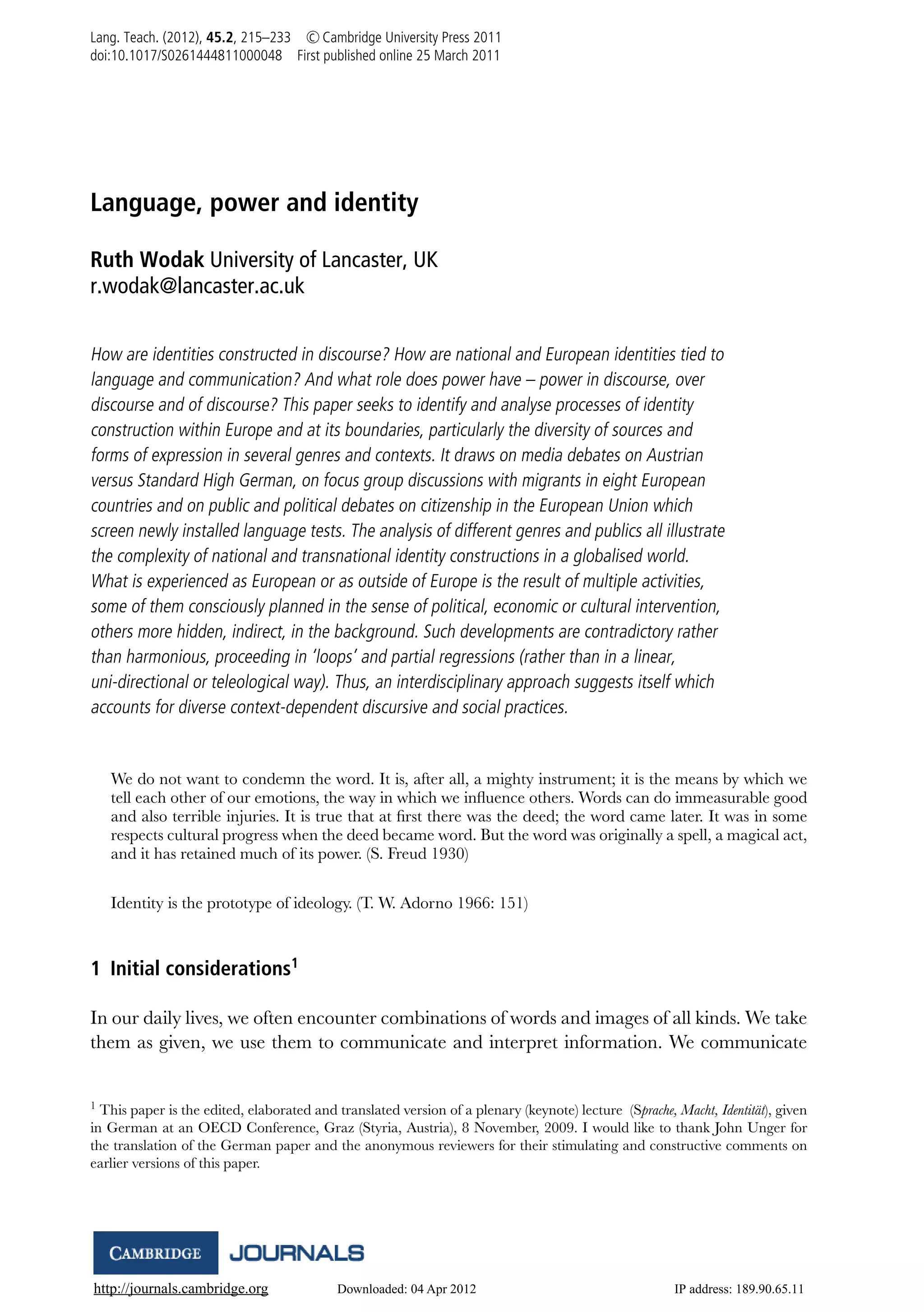 This document discusses the complex relationships between language, power, and identity. It provides examples of how identities are constructed through language choices and how power dynamics influence these constructions. Specifically, it examines: