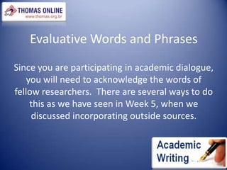 This document discusses language that can be used in argumentative essays to acknowledge other researchers' opinions, agree or disagree with their views, and suggest alternatives. It provides words and phrases like "although" and "while" to qualify agreements or disagreements, and advises using conditional sentences to justify positions by suggesting alternative actions and results. The document aims to help writers incorporate evaluative language and structure into their work.