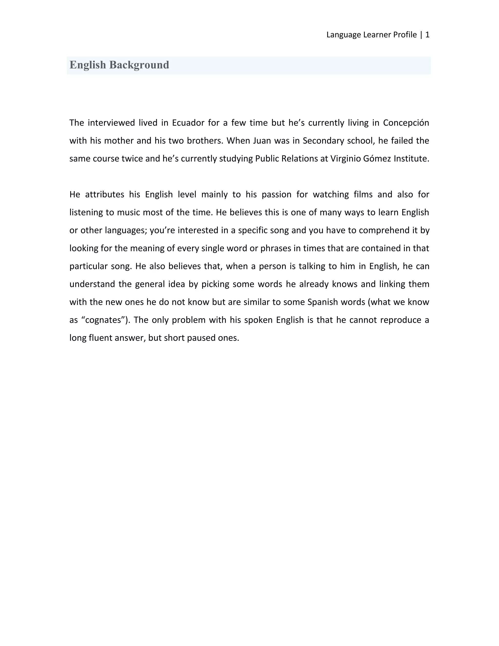 The document provides an analysis of an English language learner interview conducted in Spanish. It identifies several areas for improvement, including the omission of personal pronouns, incorrect use of tenses, and mispronunciation of certain sounds. A lesson plan is proposed to address these issues through preparation, presentation, practice and self-evaluation activities focused on asking and answering interview questions. The analysis recommends the learner gain more experience communicating in English to expand their abilities and suggests cooperation with others to enrich learning.