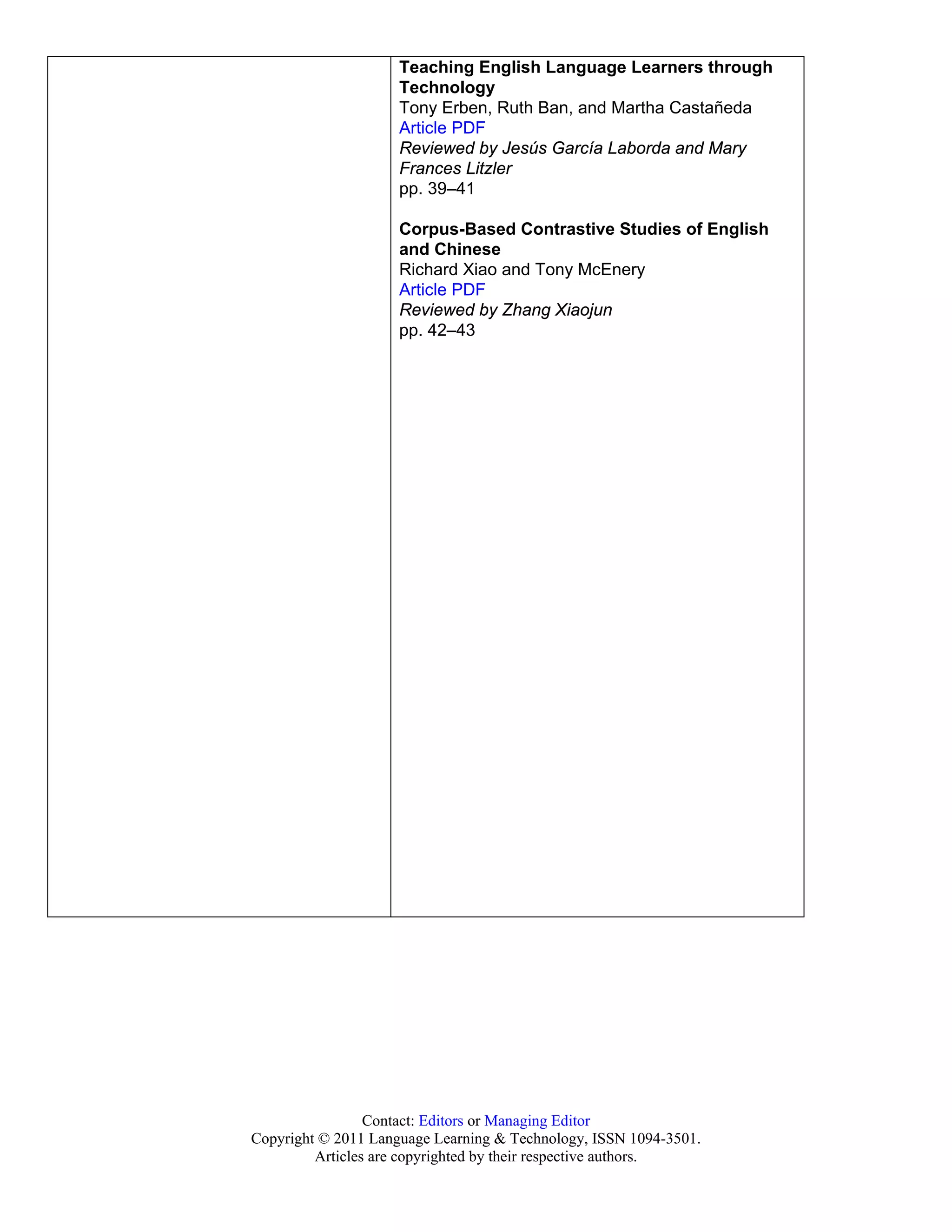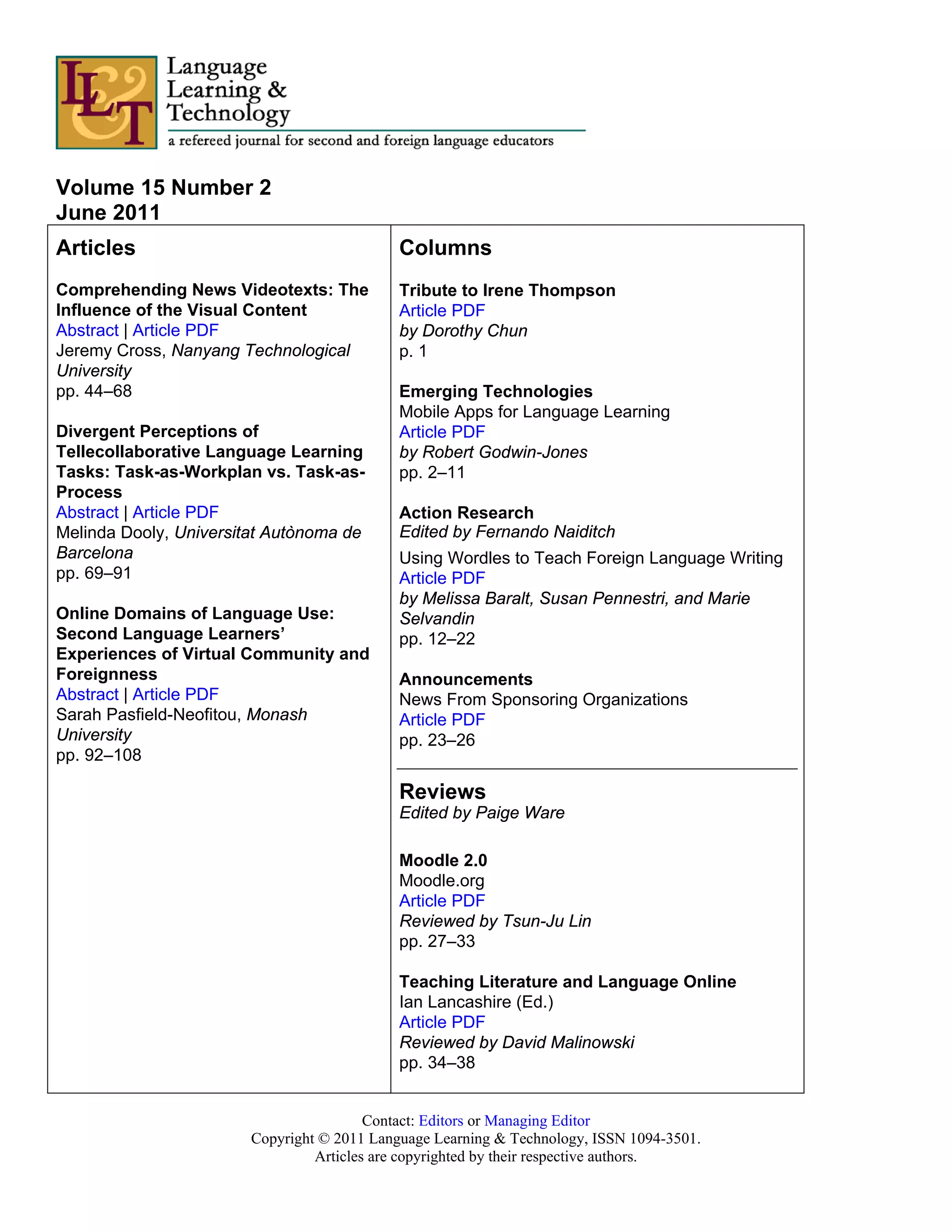 This document contains information about Volume 15, Number 2 of the journal Language Learning & Technology, including: