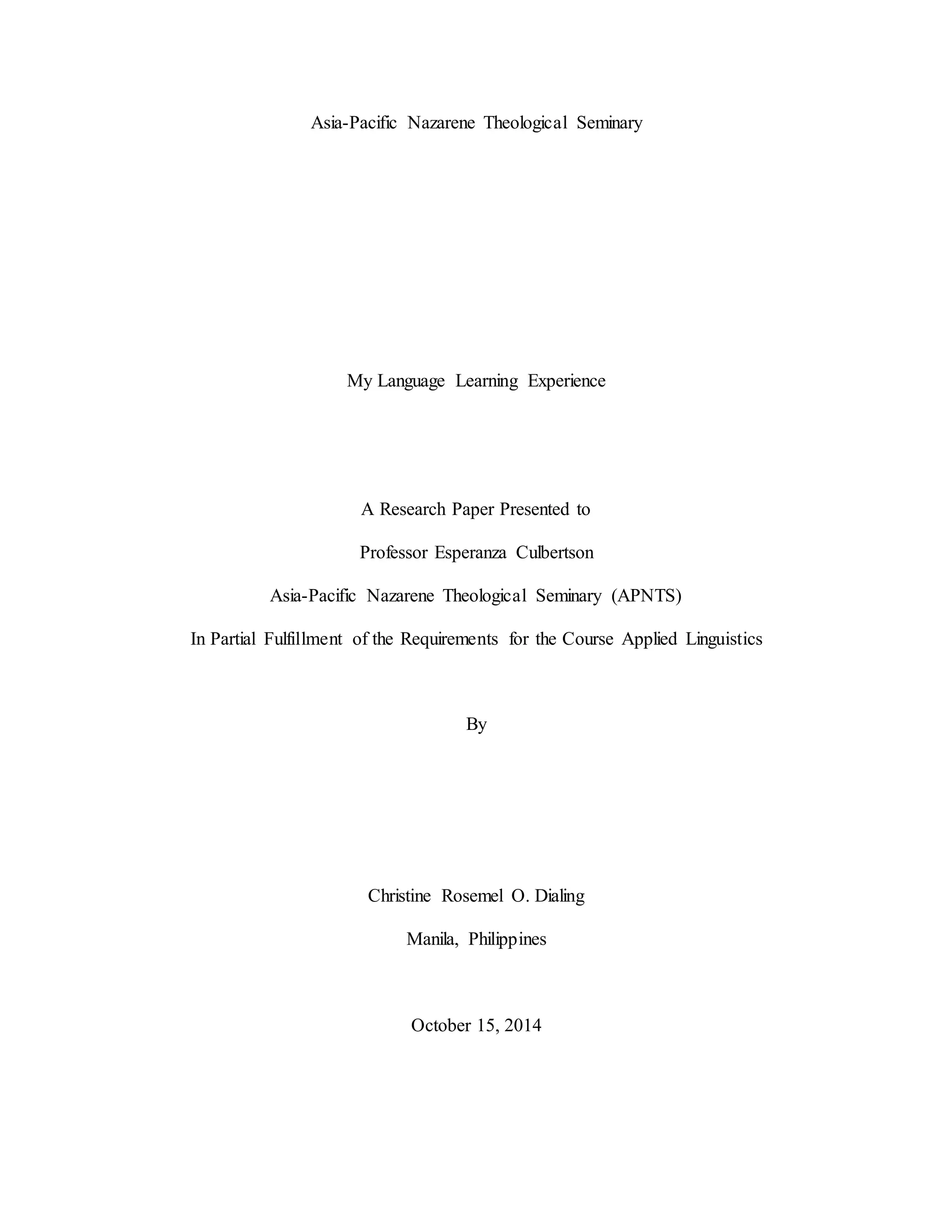 1) The document describes the author's experience learning English as a second language in the Philippines from childhood through college. She grew up speaking Hiligaynon and was first exposed to English through reading scriptures and overhearing her siblings speak it.