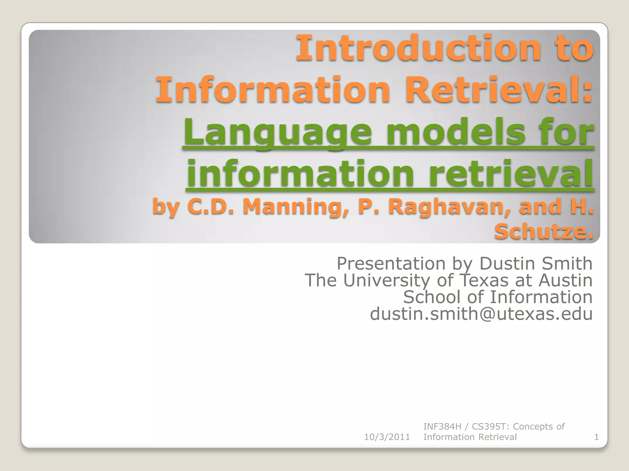 The document provides background information on Christopher Manning, Prabhakar Raghavan, and Hinrich Schutze, who are authors of the book "Introduction to Information Retrieval: Language models for information retrieval". It then outlines the presentation which discusses language models for information retrieval, including query likelihood models, estimating query generation probabilities, and experiments comparing language modeling approaches to other IR techniques.