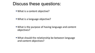 This document discusses language and content objectives. It defines a content objective as what students will learn about a subject, and a language objective as the specific language skills students will practice. The purpose of objectives is to align language and content goals so that learning a subject also helps students improve their language skills. An example is given of a content objective about classifying shapes and a language objective for a student to label types of lines and angles using certain vocabulary words. The document also provides a sample analysis of language needs and corresponding language objectives for making predictions about states of matter.