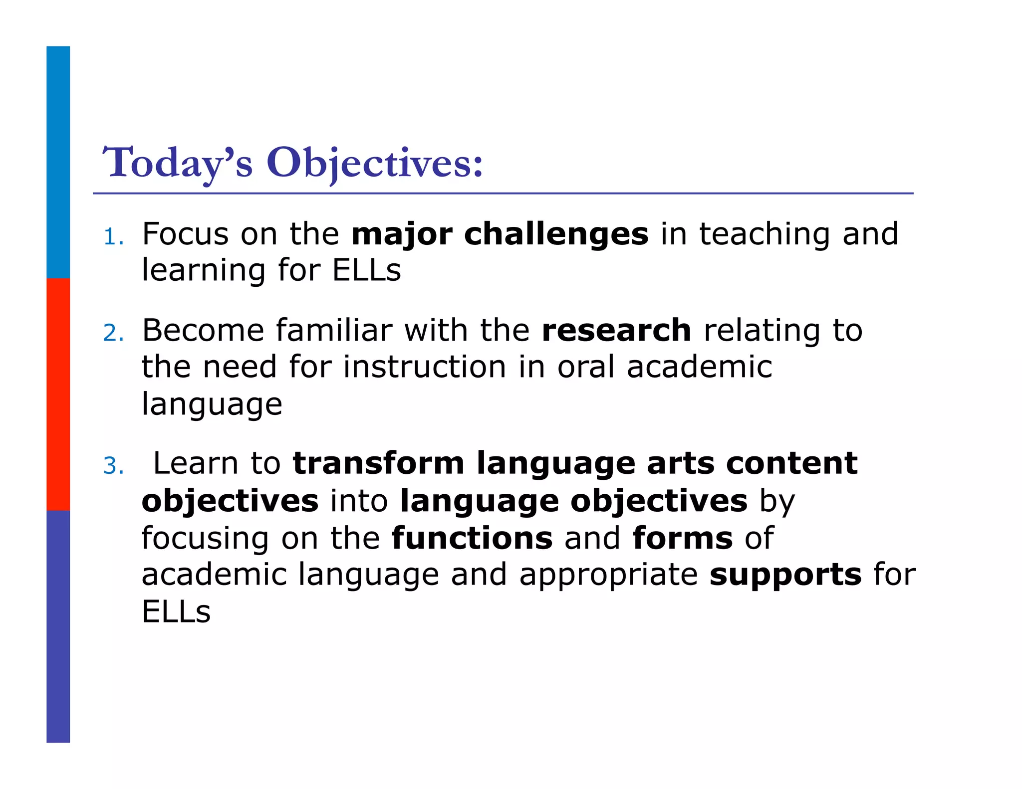 The document discusses the major challenges faced by elementary English Language Learners (ELLs) in reading and writing, particularly focusing on the need for rigorous oral and written academic language. It highlights issues such as increased text complexity, the importance of academic vocabulary, and the necessity of effective language objectives to support ELLs' learning. Research emphasizes that active language instruction, combined with specific, planned language objectives, can significantly enhance ELLs' academic performance.