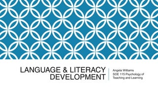 The document discusses the importance of language development for literacy. It notes that children's literacy and reading/writing abilities begin in infancy along with oral language development. Proficient readers demonstrate strategic, engaged, fluent behaviors similar to good players. The document also observes two young children in a family childcare setting, engaging with them through routines like singing, counting, and commenting on emotions. Finally, it discusses theories from Piaget and Vygotsky regarding cognitive development and the role of social interaction and language in children's thinking.