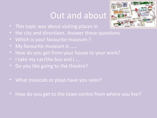 The document contains questions and prompts from various language lessons covering topics such as directions, places in the city, technology, education, ability, and grammar structures like the present perfect continuous, second conditional, and articles. The prompts are designed to elicit responses from language learners to practice and reinforce the targeted language items.