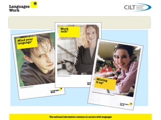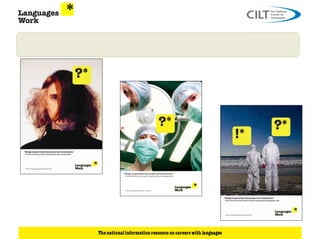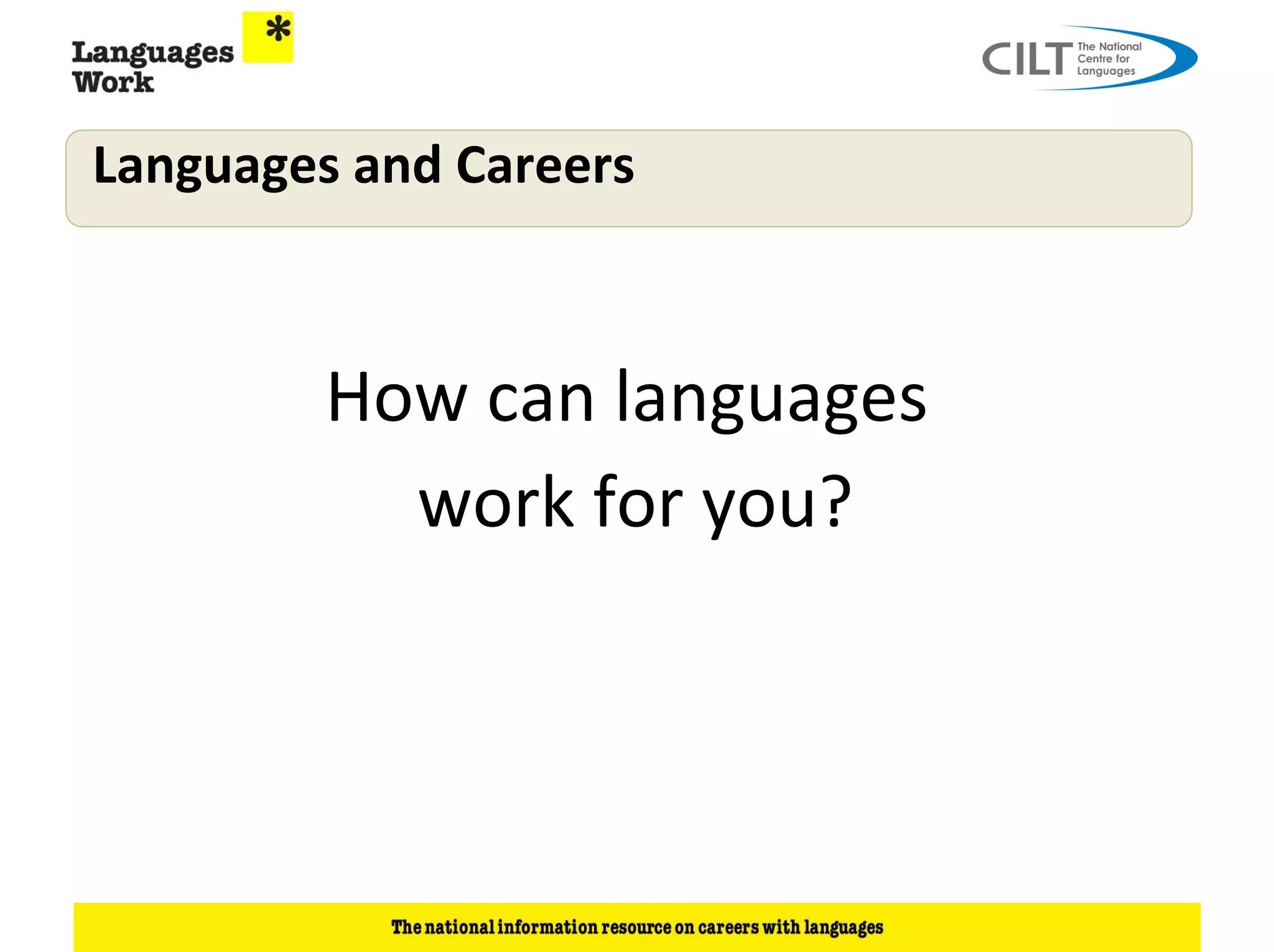 This document discusses how language skills can benefit careers and the job market. It notes that 74% of employers want language skills and 36% specifically recruit for them, with the main demand being for European languages. Language skills are in demand across diverse sectors like IT, media, law, finance, engineering, tourism and government. The document provides examples of employers advertising language-related jobs and vacancies for linguists in roles where languages are integral or an added advantage. It emphasizes that employers want the right mix of skills, not just language skills alone, and highlights the need to understand what skills employers are looking for in candidates.
