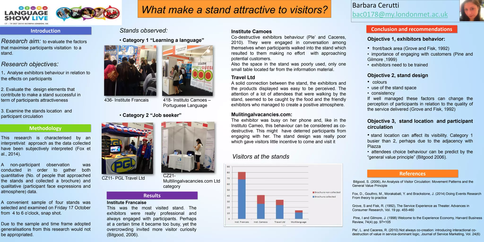 The document evaluates factors that maximize visitor engagement at exhibition stands, focusing on exhibitor behavior, stand design, and location. It highlights the importance of professional and engaging exhibitors, effective space utilization, and how location affects visibility and attendee circulation. The study utilized non-participant observations and subjective data analysis to draw conclusions, noting that certain behaviors by exhibitors negatively impacted participant engagement.