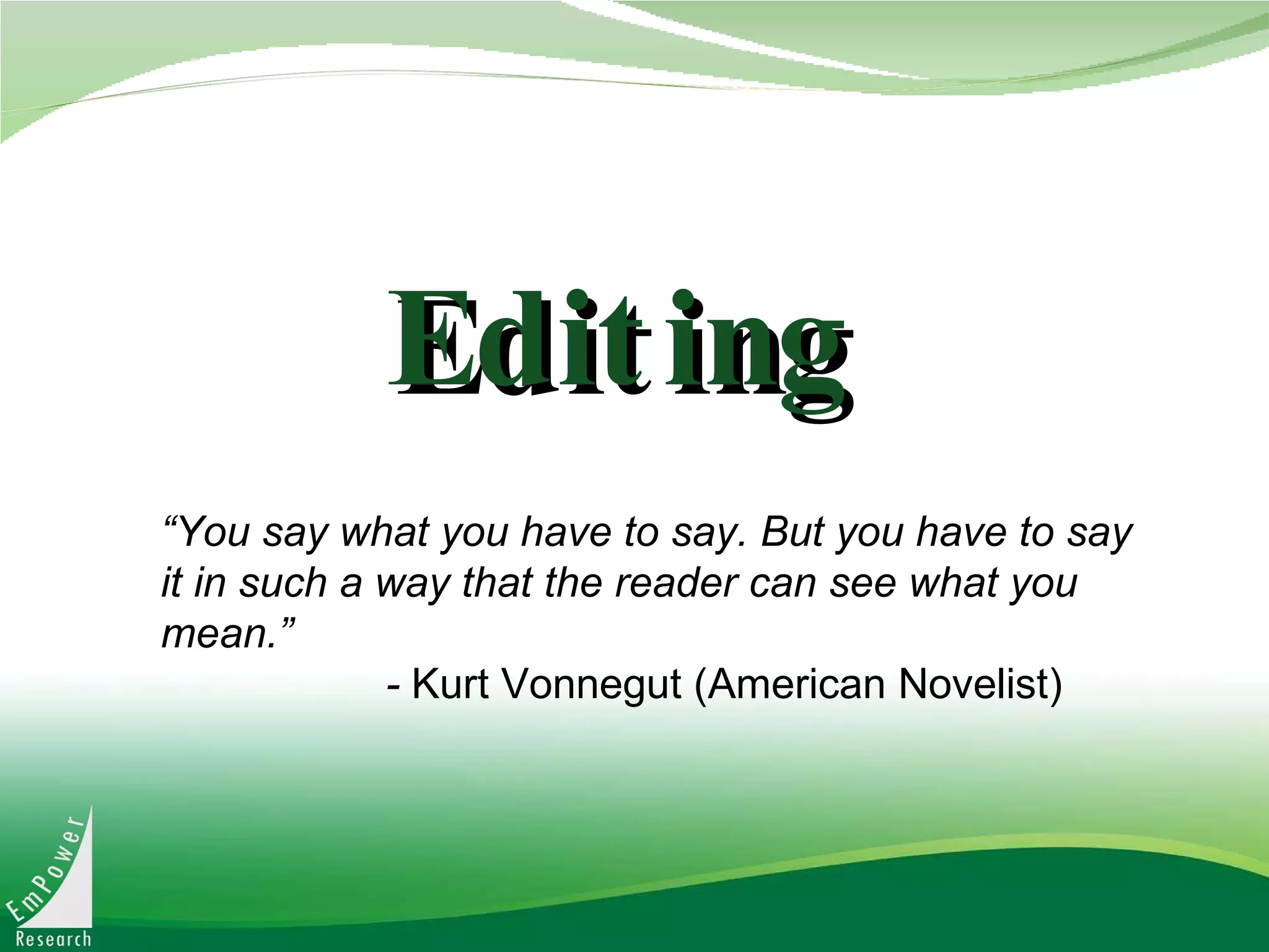 This document provides guidance on editing text for clarity, conciseness, and correctness. It discusses checking text for wordiness, agreement between subjects and verbs/nouns and pronouns, parallel structure, misplaced/dangling modifiers, spelling errors, informal language, and proper punctuation including commas, semicolons, colons and apostrophes. The overall goal of editing is to polish the writing and remove unnecessary words to make the intended meaning clear for the reader.