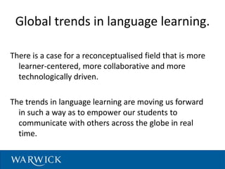 This document discusses trends in language learning and teaching in the digital age. It argues that the field is moving towards being more learner-centered, collaborative, and technologically driven. This empowers students to communicate globally in real time. However, it also presents challenges around how language is used, the teacher's role, developing digital skills, and managing resources. The document explores beliefs about how learners learn best and different approaches to teaching. It also provides examples of digital tools and platforms that can be used for language learning, including resources for content, curation, creation, and communication.
