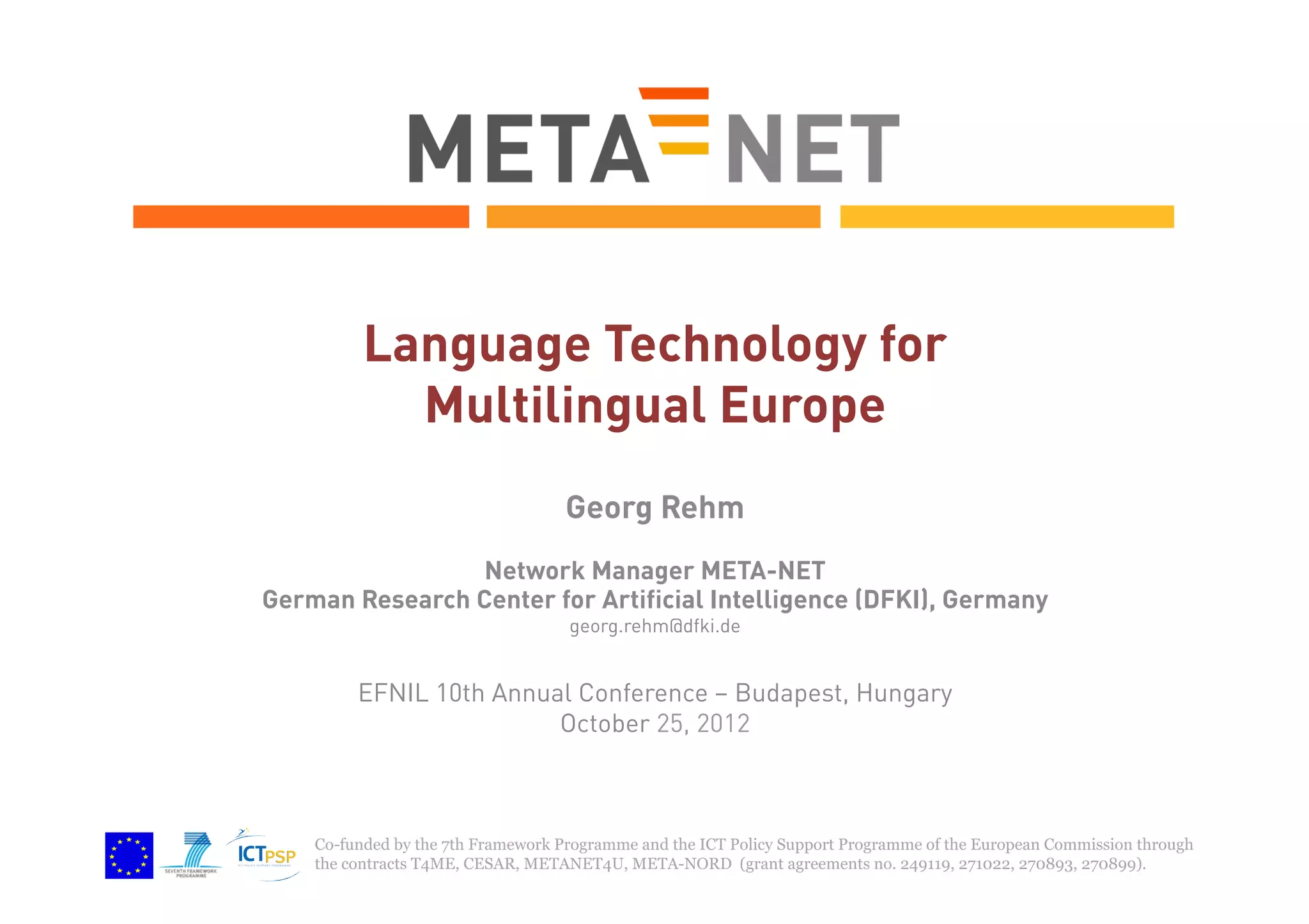 The document outlines the objectives and initiatives of META-NET, a network focused on supporting language technology for a multilingual Europe. It highlights the challenges of preserving linguistic diversity in the digital age, the open resource-sharing platform called META-SHARE, and the importance of collaboration among stakeholders. Additionally, it discusses various projects, campaigns, and the strategic research agenda aimed at enhancing language technology across Europe.