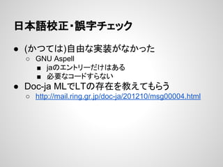Aspell ■ jaのエントリーだけはある ■ 必要なコードすらない ● Doc-ja MLでLTの存在を教えてもらう ○ http://mail.ring.gr.jp/doc-ja/201210/msg00004.html