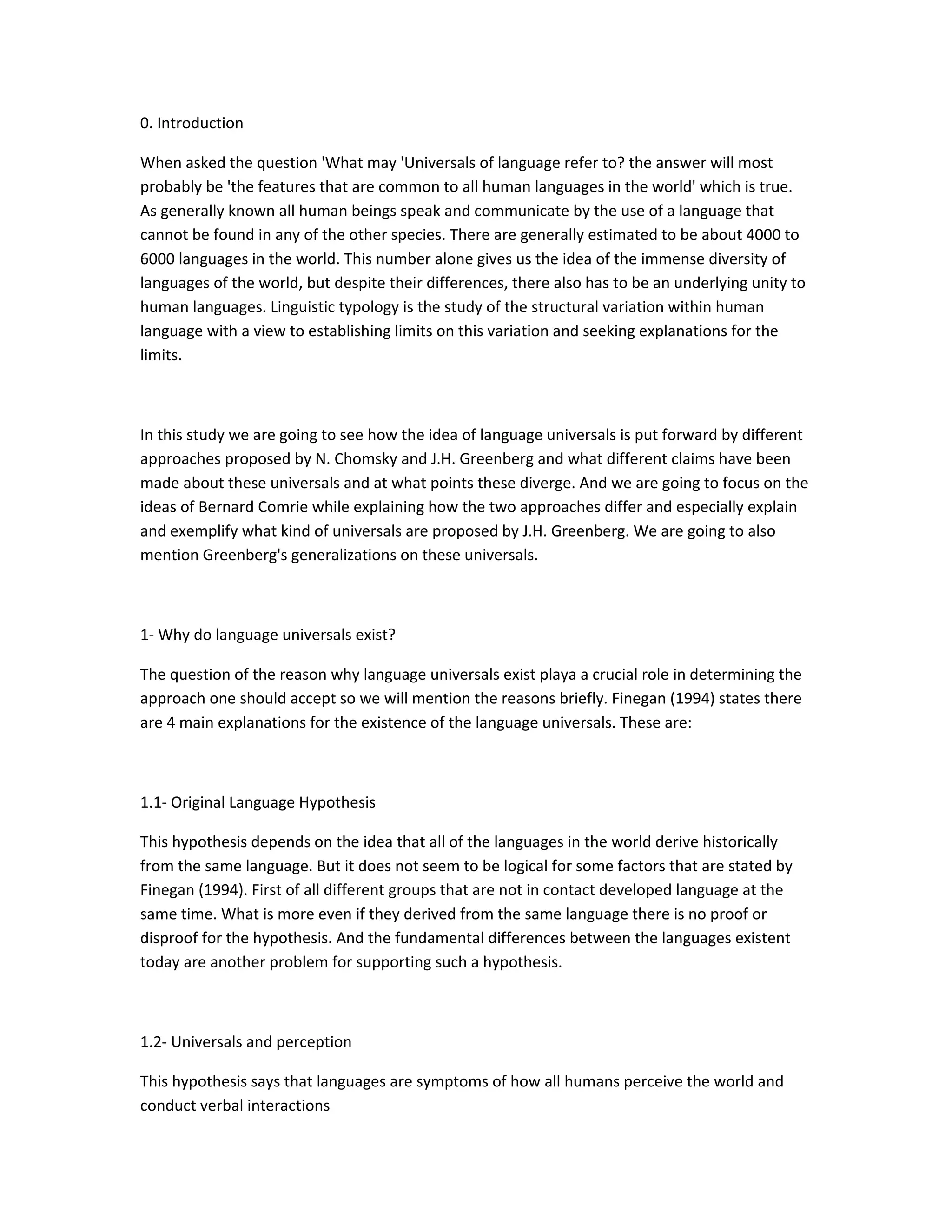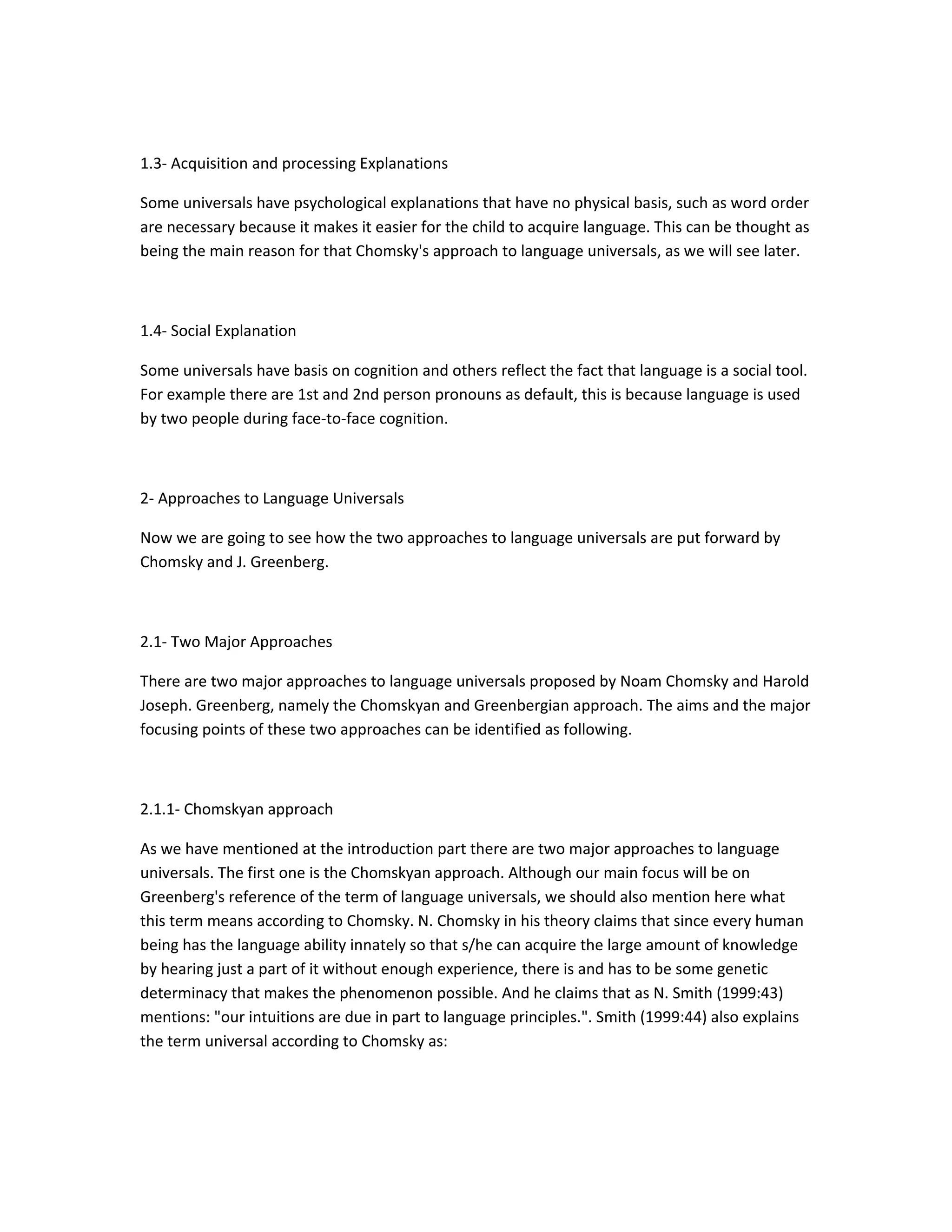 This document discusses two major approaches to language universals proposed by Noam Chomsky and Joseph Greenberg. Chomsky's approach claims that language universals are innate properties of human language that allow humans to acquire language. Greenberg examined 30 languages and found general principles that govern all human languages, like morphologic and syntactic patterns. The two approaches differ in their data sources - Chomsky focuses on one language's abstract structures while Greenberg compares surface structures across many languages. They also propose different explanations for why language universals exist, like innate properties versus reflecting human cognition and social interaction.
