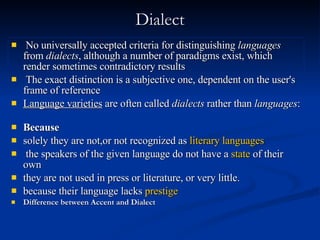 This document discusses various types of language variation including dialects, sociolects, idiolects, registers, pidgins, and creoles. It notes that dialects are varieties of a language used by a particular group that share non-linguistic characteristics. Pidgins develop for communication between groups that don't share a common language, while creoles emerge when a pidgin becomes a community's native language.
