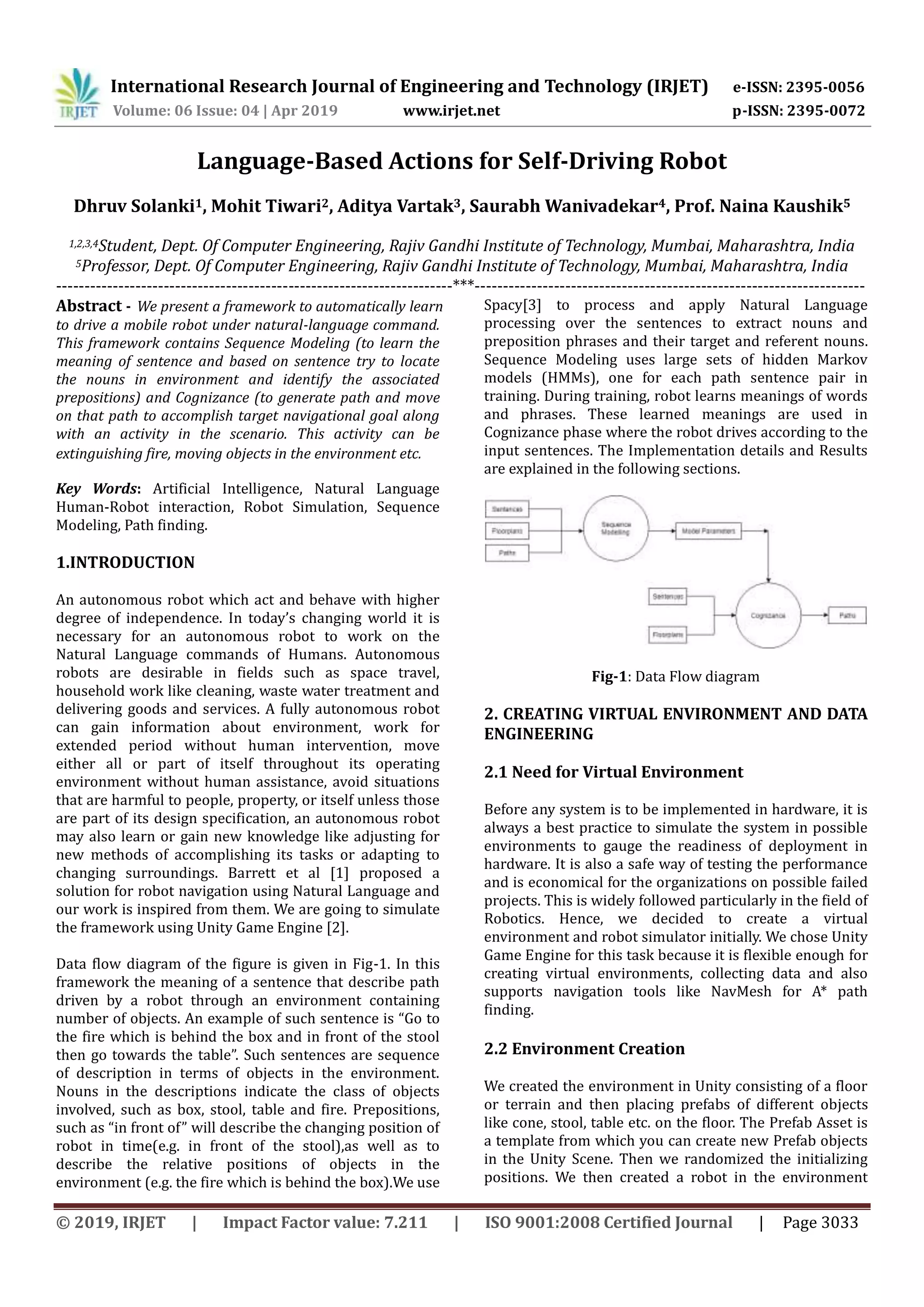 This document describes a framework for a self-driving robot to follow natural language commands. The framework uses sequence modeling to learn the meaning of sentences describing a path and identify relevant objects and prepositions. It then uses this information in the cognizance phase to generate a path and move the robot to accomplish the navigational goal described in the input sentence. The researchers created a virtual environment using Unity game engine to simulate the robot and collect training data on floor plans, sentences, and robot paths. They preprocessed this data and used hidden Markov models and a probabilistic graphical model to represent the temporal segments of sentences and learn the relationships between objects for sequence modeling.