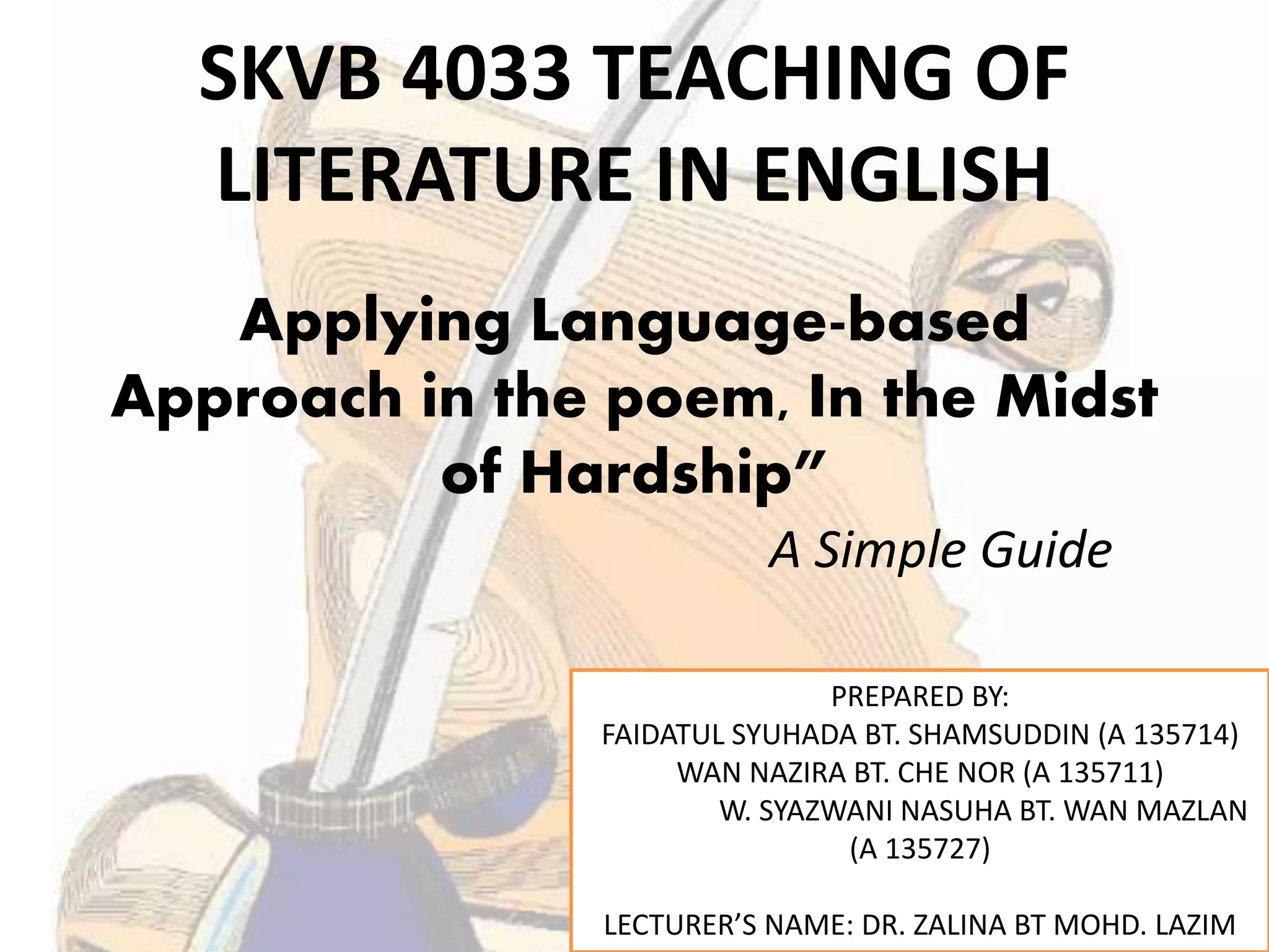 This document provides an overview of the language-based approach for analyzing poetry. It discusses how literary texts can help improve student language proficiency by exposing them to vocabulary and language aspects. The key issues of the approach are examining the imaginative and representational uses of language, pedagogical value, how language works within a text, and understanding meanings. When applying this approach to a poem, students identify significant parts, patterns of sounds, imagery, and elements of contrast. The lesson plan aims to teach the theme of perseverance through imagery in the poem and create a dialogue using words from the text.