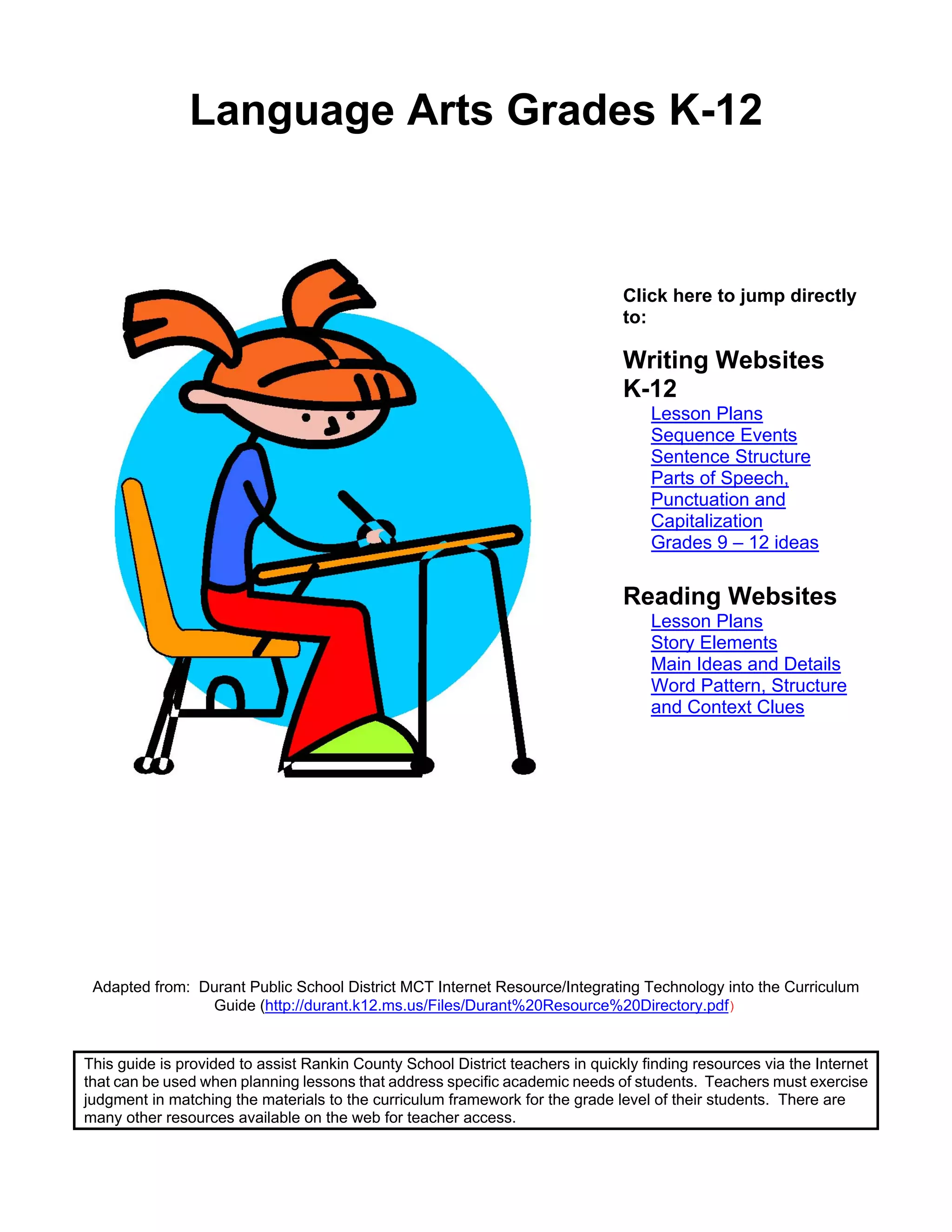 This document provides resources for teaching language arts from grades K-12, including websites for lesson plans, student activities and tools. It includes resources for teaching writing, such as lesson plans focused on parts of speech, punctuation and capitalization. It also includes resources for teaching reading, such as lesson plans addressing story elements and main ideas. The document aims to assist teachers in finding online materials to address specific academic needs of students.