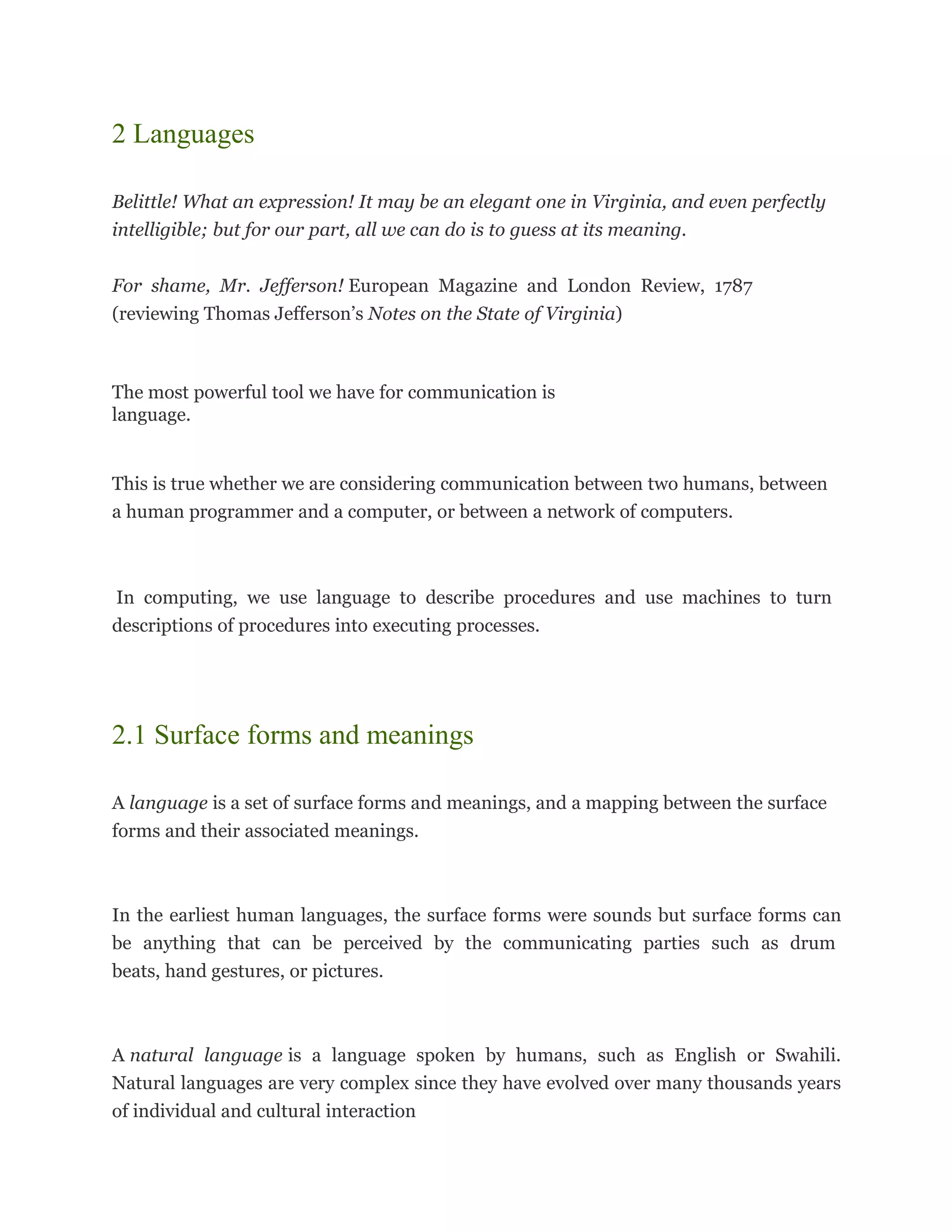 The document discusses how languages allow for communication through a mapping between surface forms like words and their associated meanings, while natural languages are very complex since they evolved over thousands of years; it also explains how simple communication systems can be represented with a table linking symbols and meanings but this is limited because it cannot represent an infinite number of possible meanings, whereas useful languages must be able to express infinitely many different meanings.