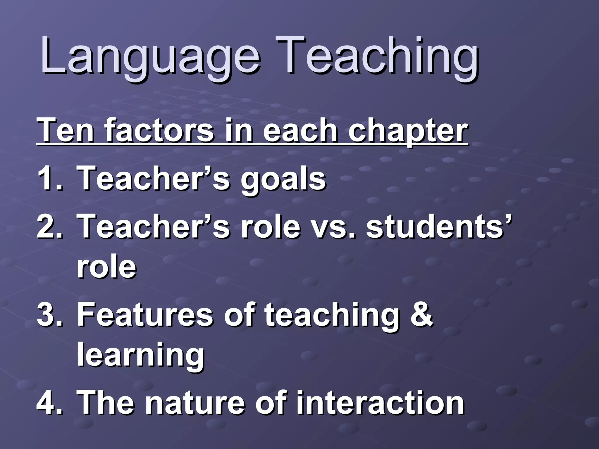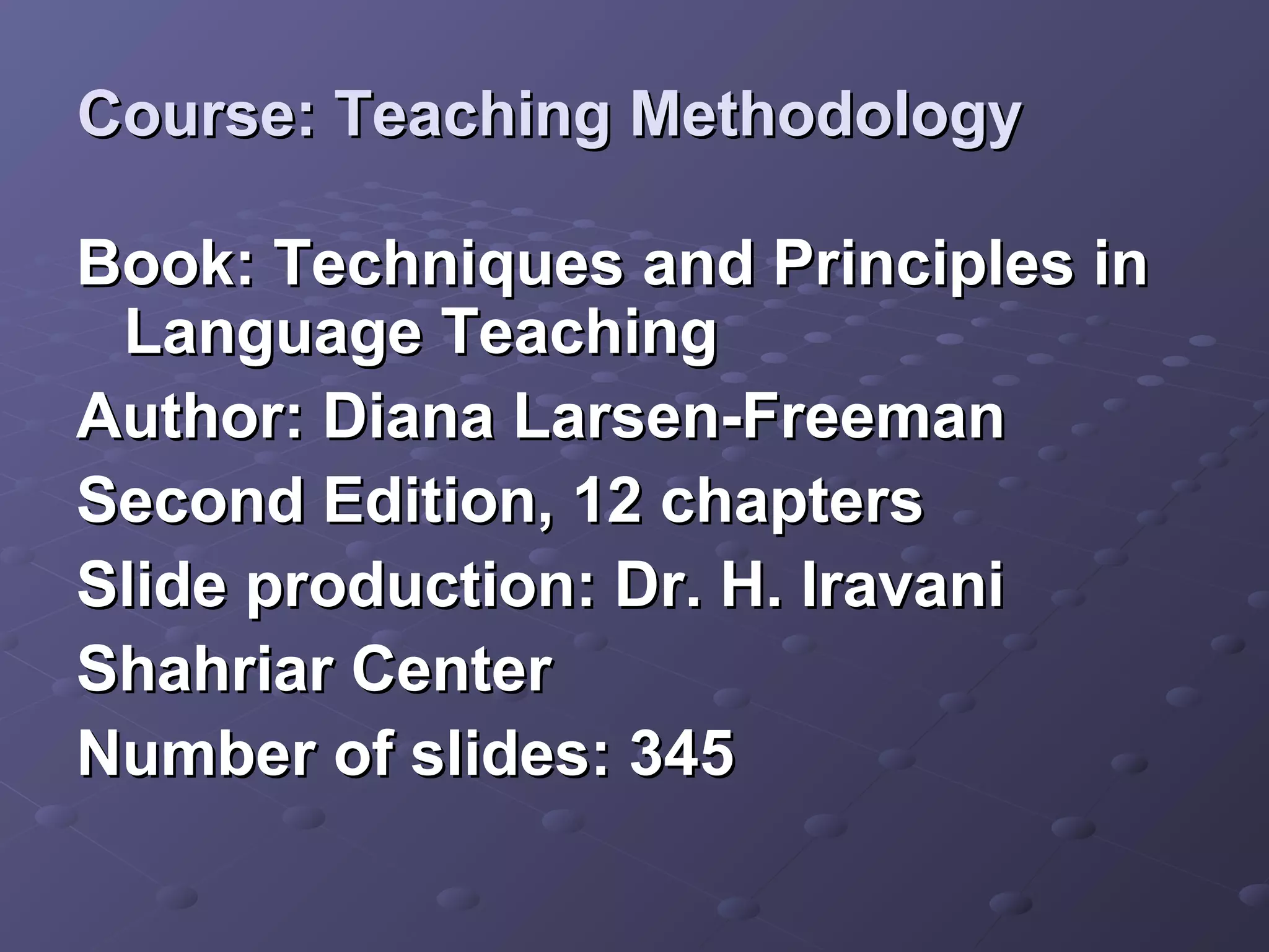 This document provides an overview of the Teaching Methodology course book "Techniques and Principles in Language Teaching" by Diana Larsen-Freeman. The book contains 12 chapters, each with 10 factors discussing different language teaching methods. It summarizes the key principles and techniques of several historical methods, including Grammar Translation, Direct Method, and Audio-Lingual Method.