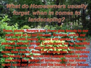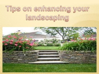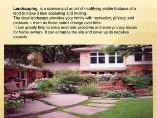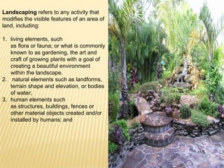 Landscaping refers to modifying the visible features of an area of land through living elements like plants, natural elements like landforms, and human elements like structures. It aims to make the landscape look appealing through recreation areas, privacy, and aesthetic solutions to problems while considering maintenance over time. Effective landscaping requires planning elements like plants, hardscapes, lighting, water features, and spaces for various uses.