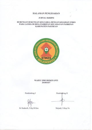 Penelitian ini mengeksplorasi hubungan antara dukungan keluarga dan kejadian stres pada lansia di desa Pasrepan, Pasuruan. Hasil menunjukkan bahwa sebagian besar dukungan keluarga berada pada kategori sedang dan terdapat hubungan signifikan antara dukungan keluarga dan tingkat stres lansia dengan nilai p = 0,031. Dukungan keluarga yang baik dapat mengurangi kejadian stres pada lansia, sedangkan kurangnya dukungan dapat meningkatkan stres.
