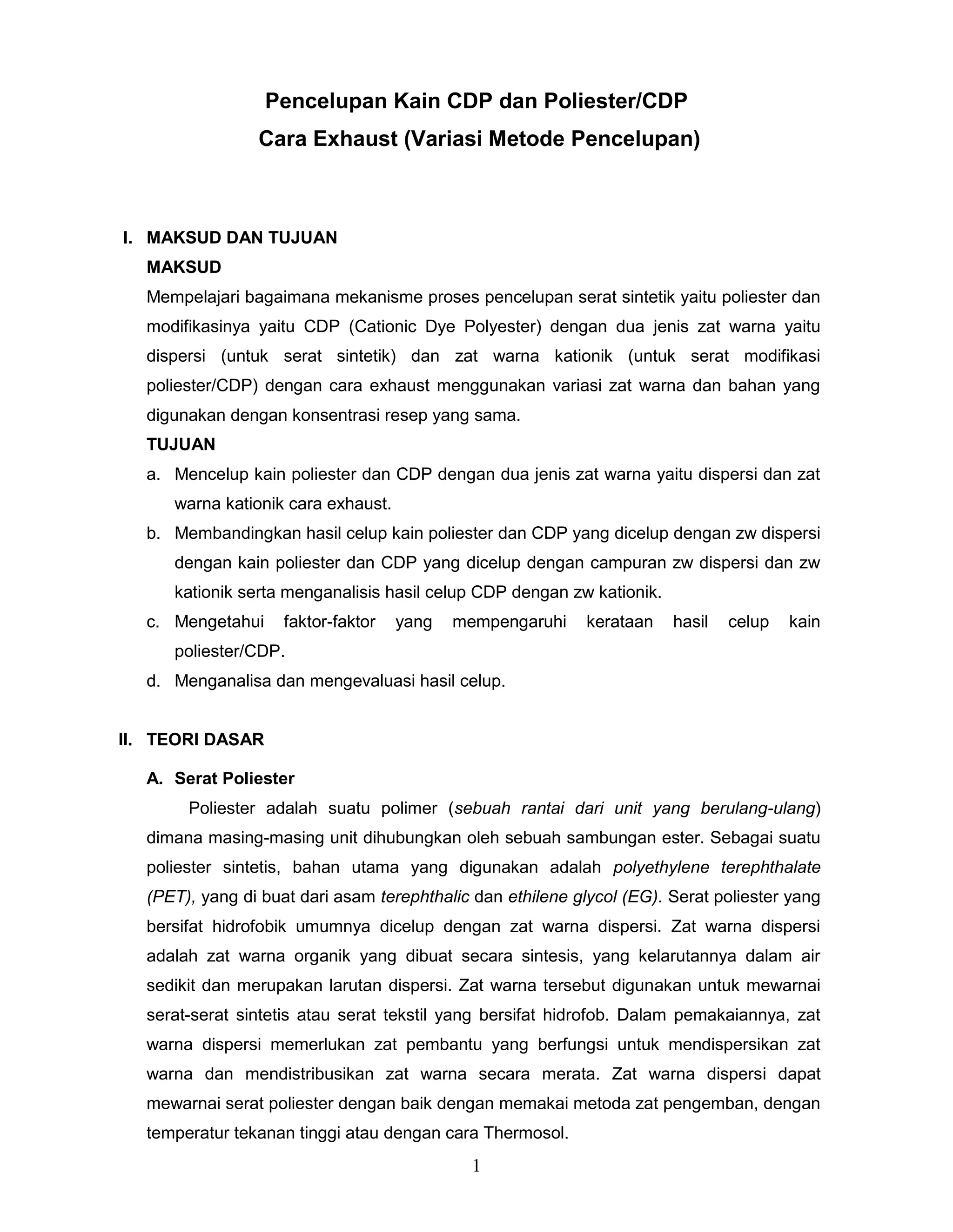 Dokumen ini membahas proses pencelupan kain poliester dan cationic dye polyester (cdp) menggunakan dua jenis zat warna, yaitu dispersi dan kationik, serta metode exhaust dengan variasi zat dan konsentrasi. Tujuannya adalah untuk membandingkan hasil pencelupan serta menganalisis faktor-faktor yang mempengaruhi kerataan hasil celup. Dokumentasi meliputi teori dasar, alat dan bahan percobaan, resep, serta langkah-langkah praktikum yang diperlukan.